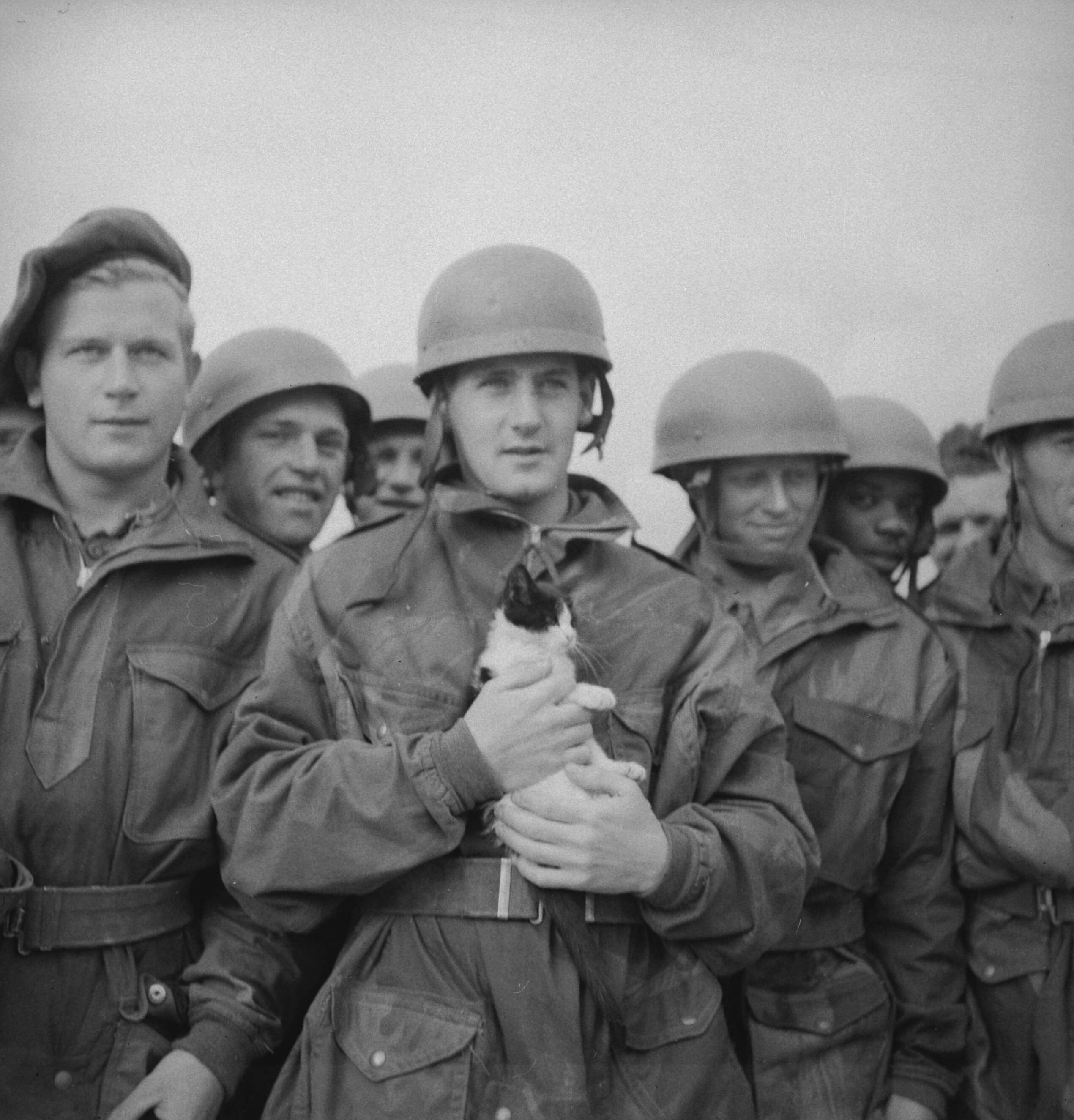 Nederlandse soldaten worden door de RAF getraind als parachutisten. Een groep parachutisten met hun mascotte, een katje