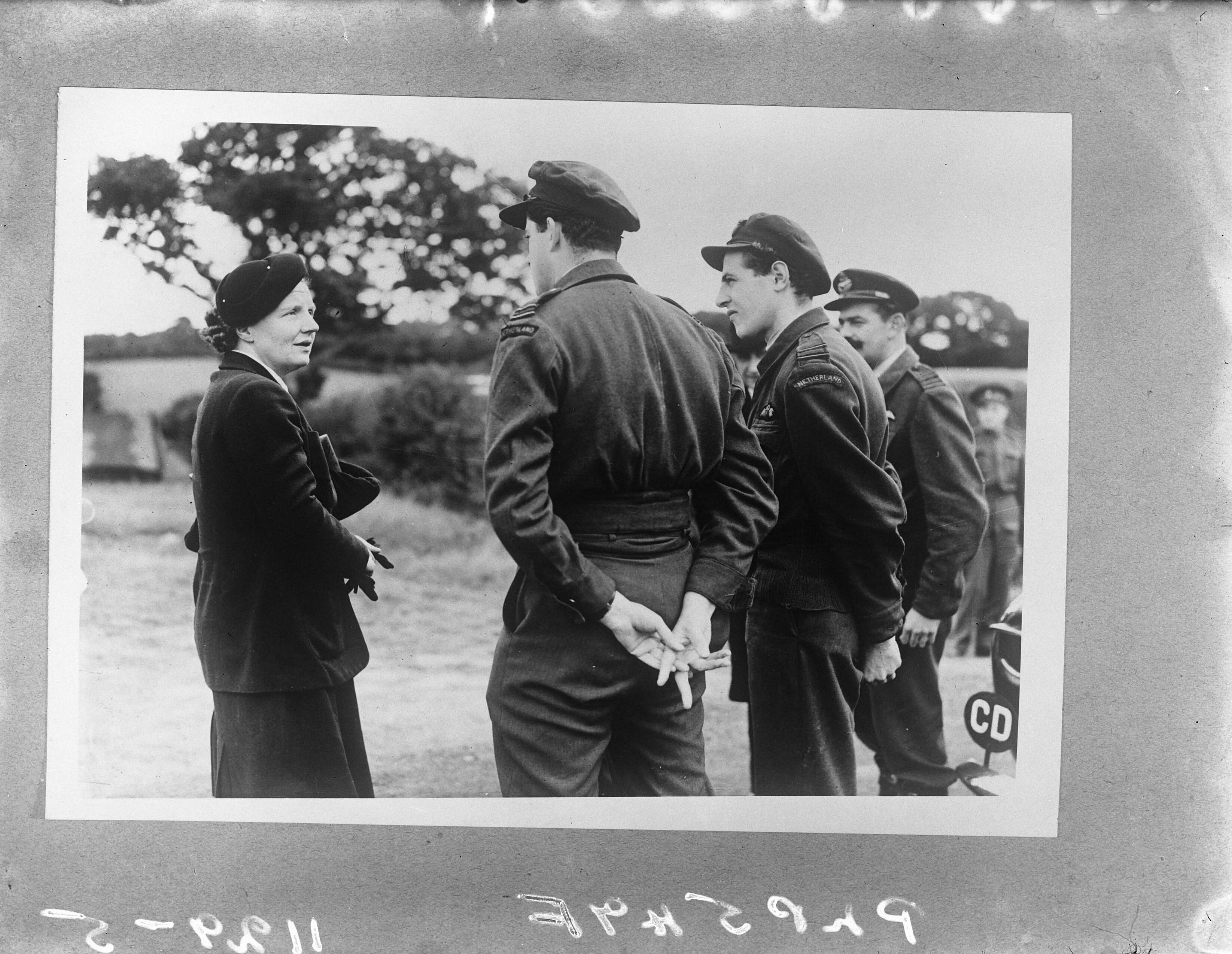 Prinses Juliana in gesprek met twee vliegers. Rechts squadron leader L.C.M. van Eendenburg