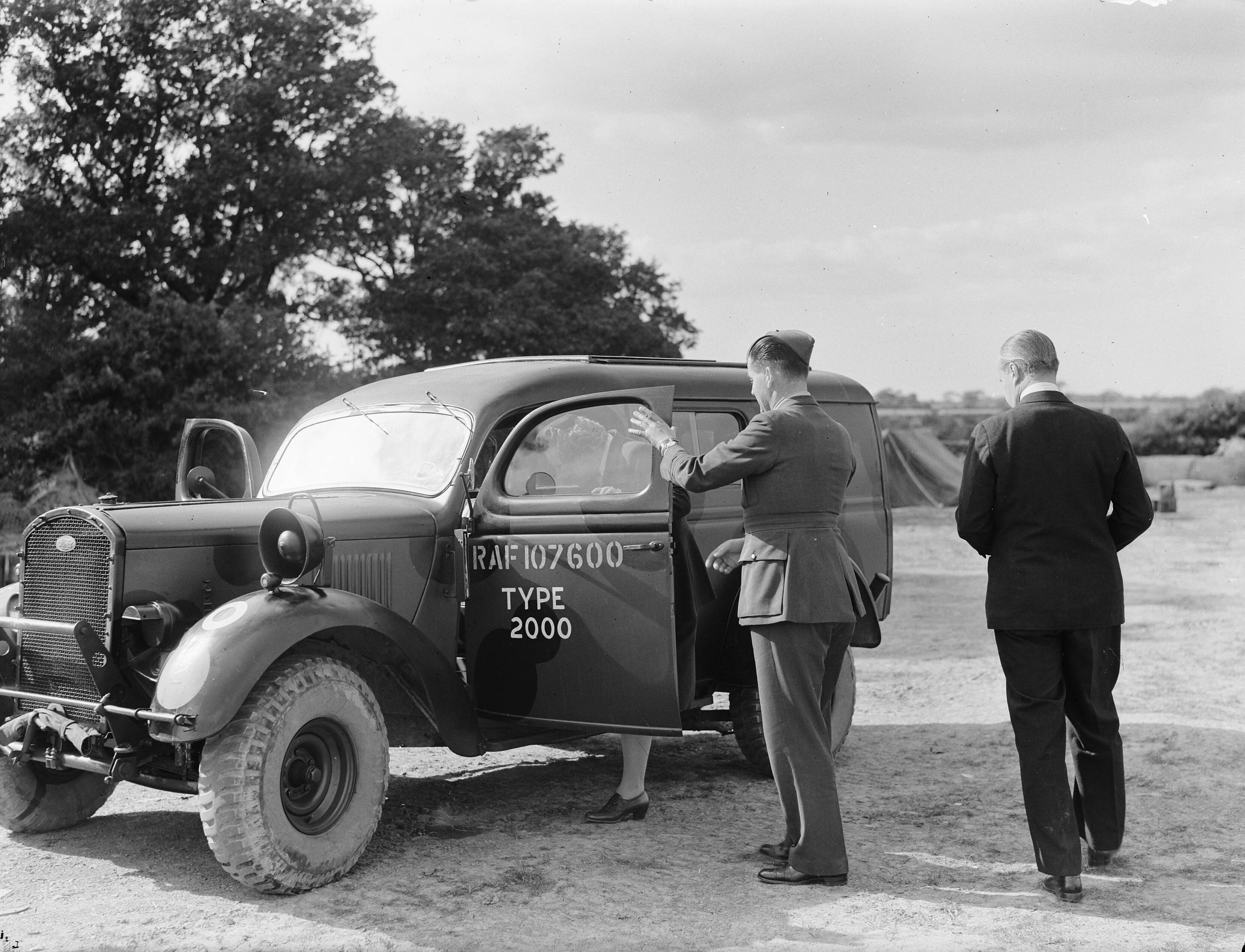 Vertrek van prinses Juliana, zij stapt in een auto van de RAF