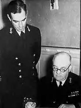 Vice-admriaal Conrad Helfrich, opperbevelhebber van de Nederlandse Strijdkrachten in Azië, met zijn adjudant luitenant-commandeur ...