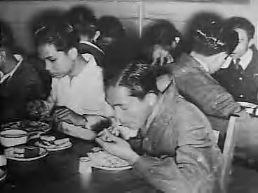 Javaanse munitiewerkers lunchen in Australische vliegtuigcomponenten fabriek. Deze mannen slaagden erin van Java te ontsnappen na de Japanse invasie