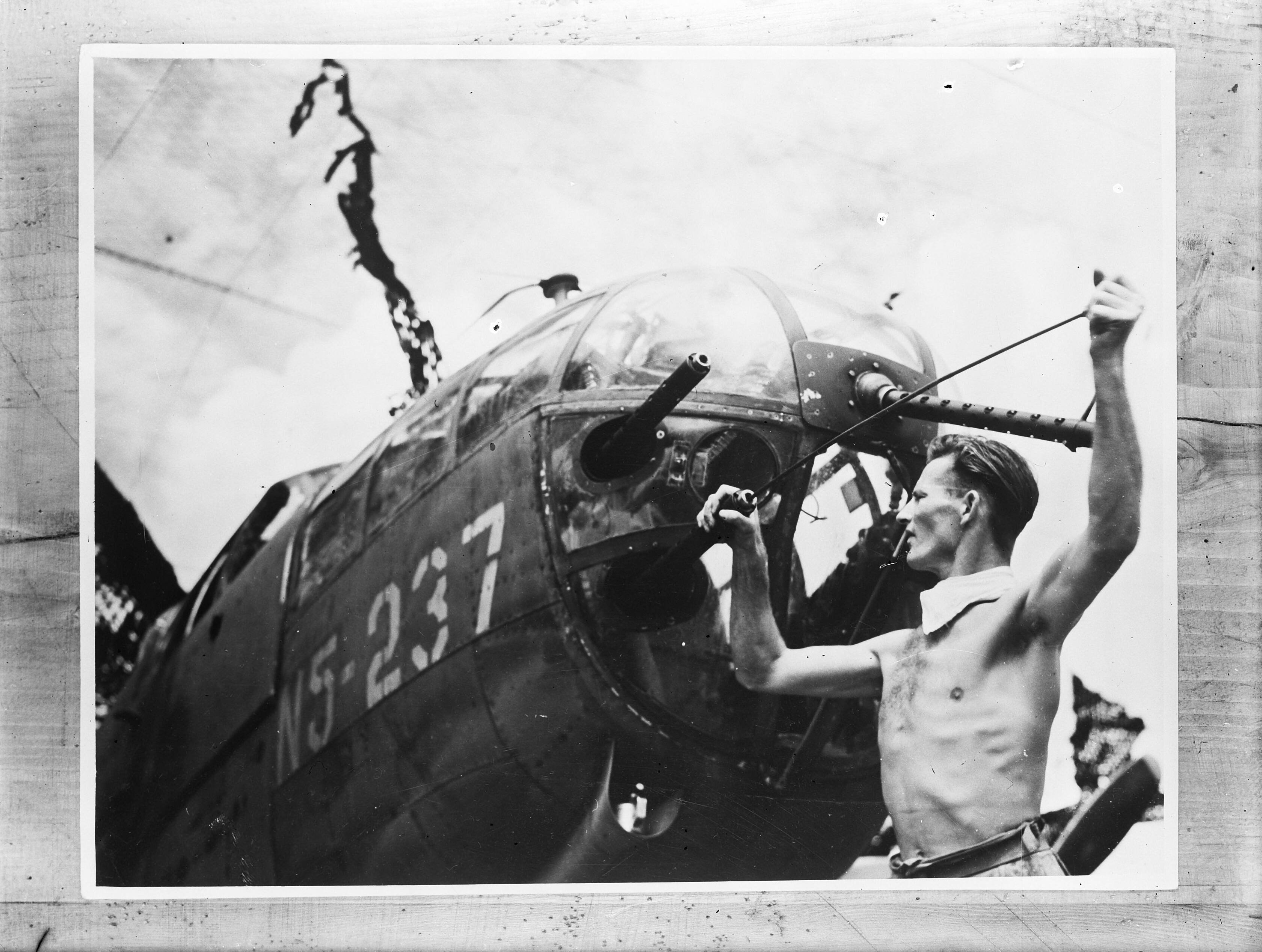 Op een Australische basis wordt een middelzware bommenwerper van de KNIL luchtmacht gerepareerd en schoongemaakt. Een Australisch lid van het grondpersoneel maakt een machinegeweer schoon