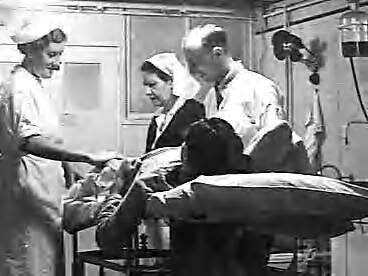 Hospitaalschip "Oranje" arriveert in Melbourne, met aan boord gewonde Australische en Nieuw-Zeelandse soldaten uit Engeland en Birma. Een van de gewonde soldaten aan boord wordt geholpen in de gipskamer door een Australische verpleegster en een mannelijke verpleger onder supervisie van de Nederlandse verpleegster mej. Van den Berg