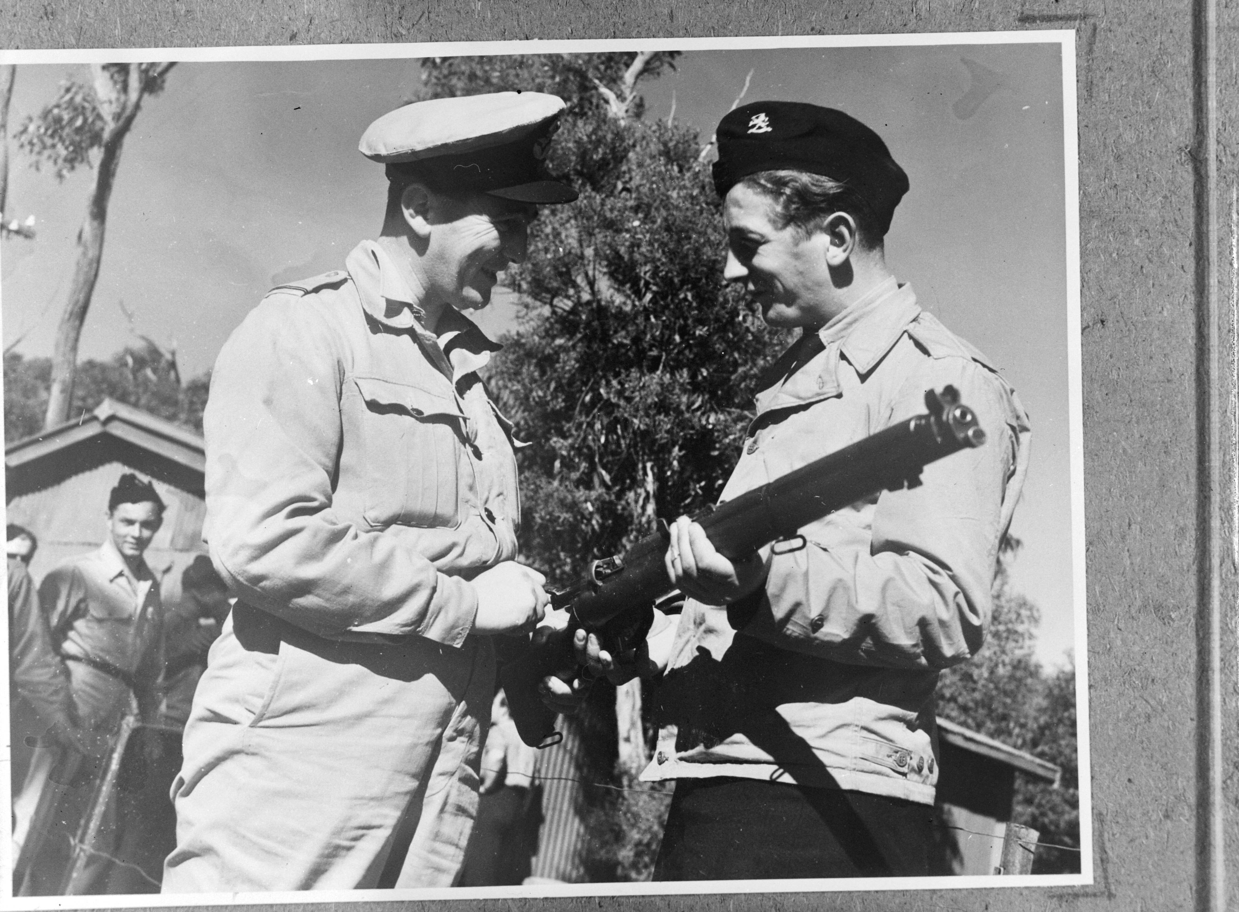 Recruten van ML-KNIL (Militaire Luchtvaart Koninklijk Nederlands Indisch Leger) in training op Camp St. Ives Bradfield Park bij Sydney (New South Wales). P.O Jones uit Sydney, officier luchtmachtbewaking, instrueert het gebruik van een Lee-Enfield geweer, die net is uitgereikt aan soldaat S.J.H. Breuk uit 's-Hertogenbosch, oud 26 jaar, die piloot wil worden