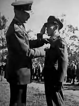 Koninklijk Nederlands-Indisch Leger (KNIL); uitreikingen onderscheidingen Militaire Willems Orde in Camp Columbia te Brisbane. Sergeant M.C. Kokkelink krijgt de versierselen opgespeld door luitenant-generaal L.H. van Oyen