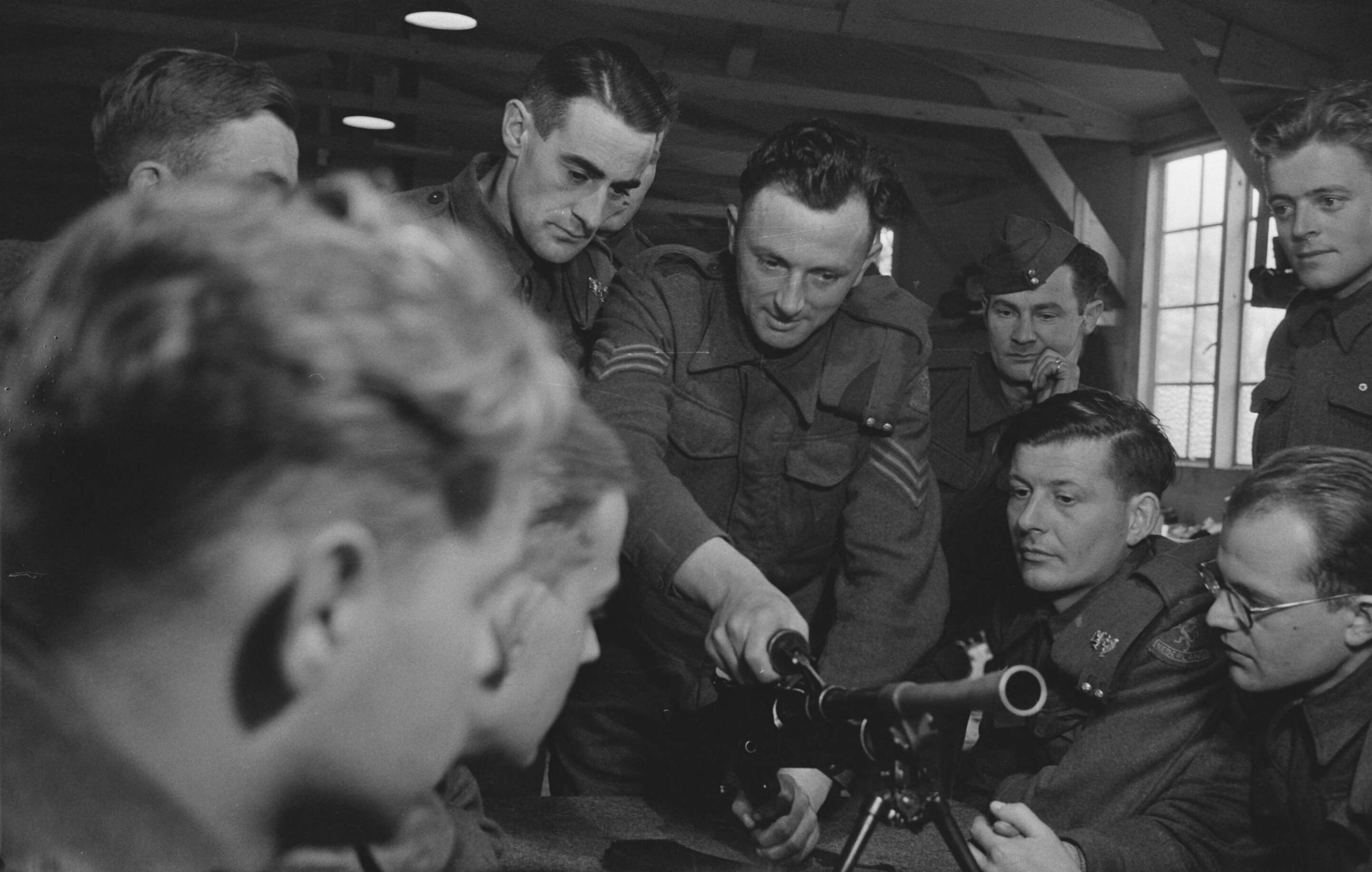 Prinses Irene Brigade. Recruten uit Zuid-Afrika. Bijschrift "South Africa and Holland are linked with many ties of kinship and the Dutch call for volunteers has met with a great response in the S.A. Republic (Republic doorgestreept). Young "Afrikaanders" (doorgestreept en i.p.v. "S. Africans") have felt the Dutch blood of their ancestors stir in their veins and have enlisted in scores. The older ones have not lagged behind, but have joined up in the hope of being able to do at last something for the country they cherish. The first contigents of South Africans have now reached Great Britain and are being trained with their Dutch Comrades of the Netherlands Brigade" Photo no 815. The intricacies of the Bren gun explained