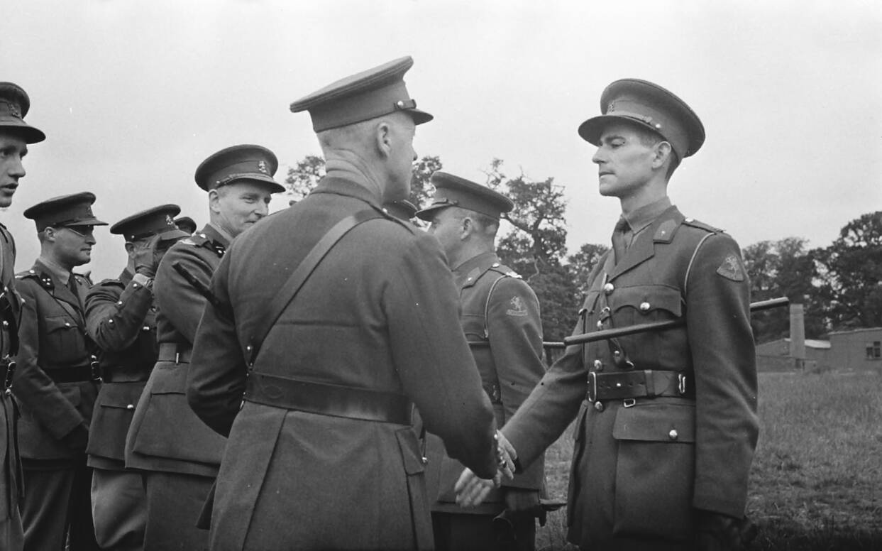 Prinses Irene Brigade brigadecommandant De Ruyter van Steveninck en inspecteur-generaal Phaff. Phaff schudt de hand van een luitenant