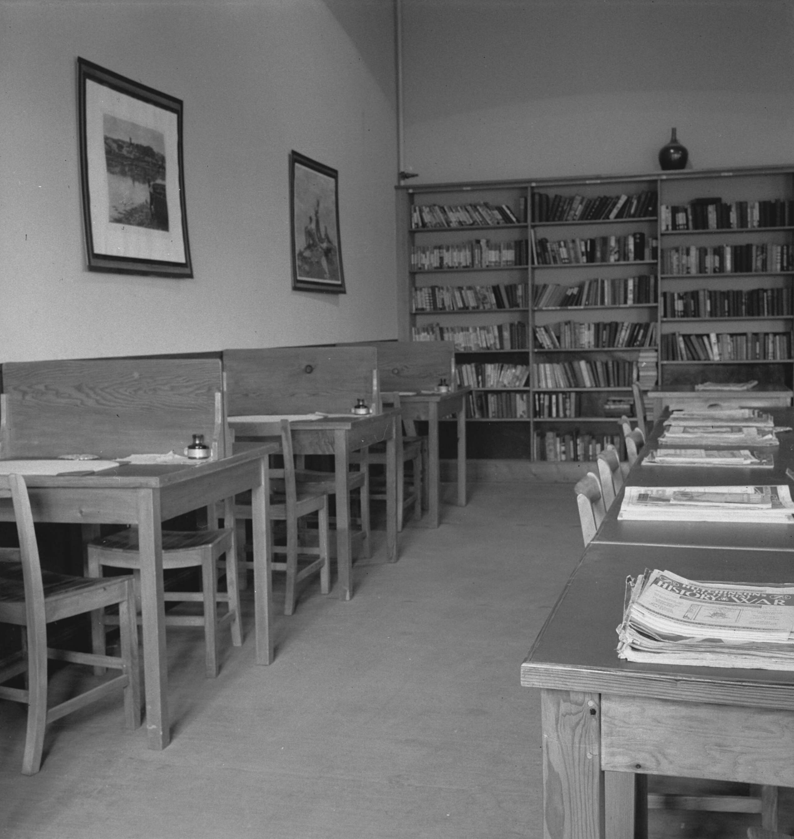 General view of the library and reading room. Kantine en recreatieruimtes in het Nederlandse legerkamp in Wolverhampton.