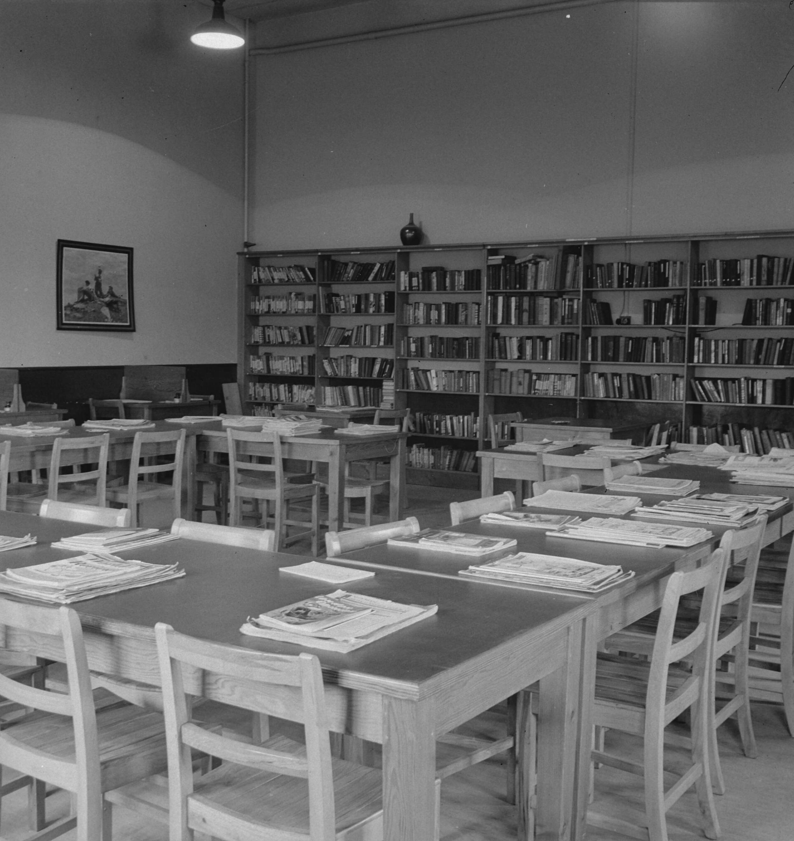 Army 559 General view of the library and reading room. Kantine en recreatieruimtes in het Nederlandse legerkamp in Wolverhampton.