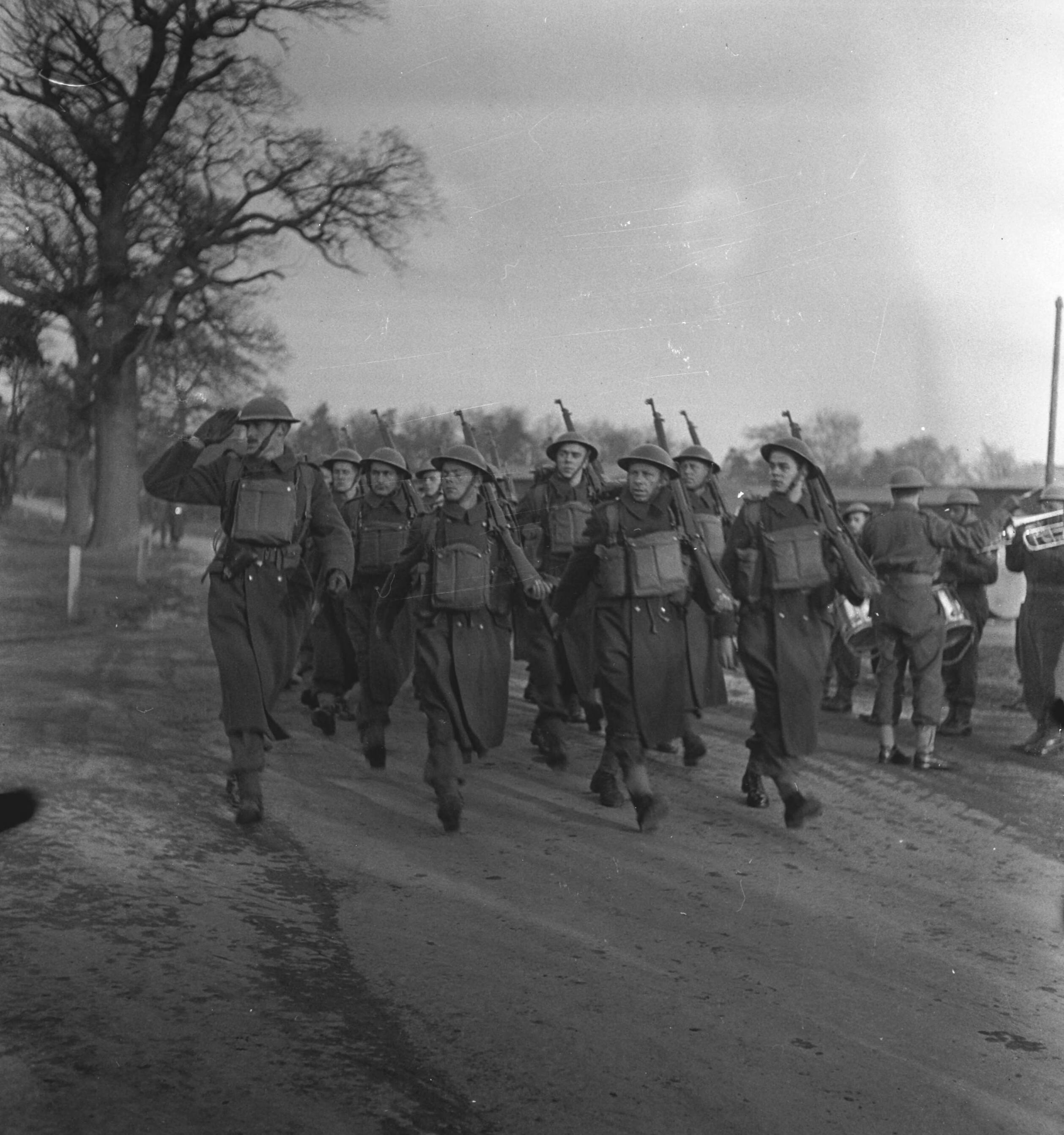 Prinses Irene Brigade. "69. 'Eyes right'. Lt. de Jonge with his platoon. 'Ogen rechts', luitenant de Jonge en zijn peloton.