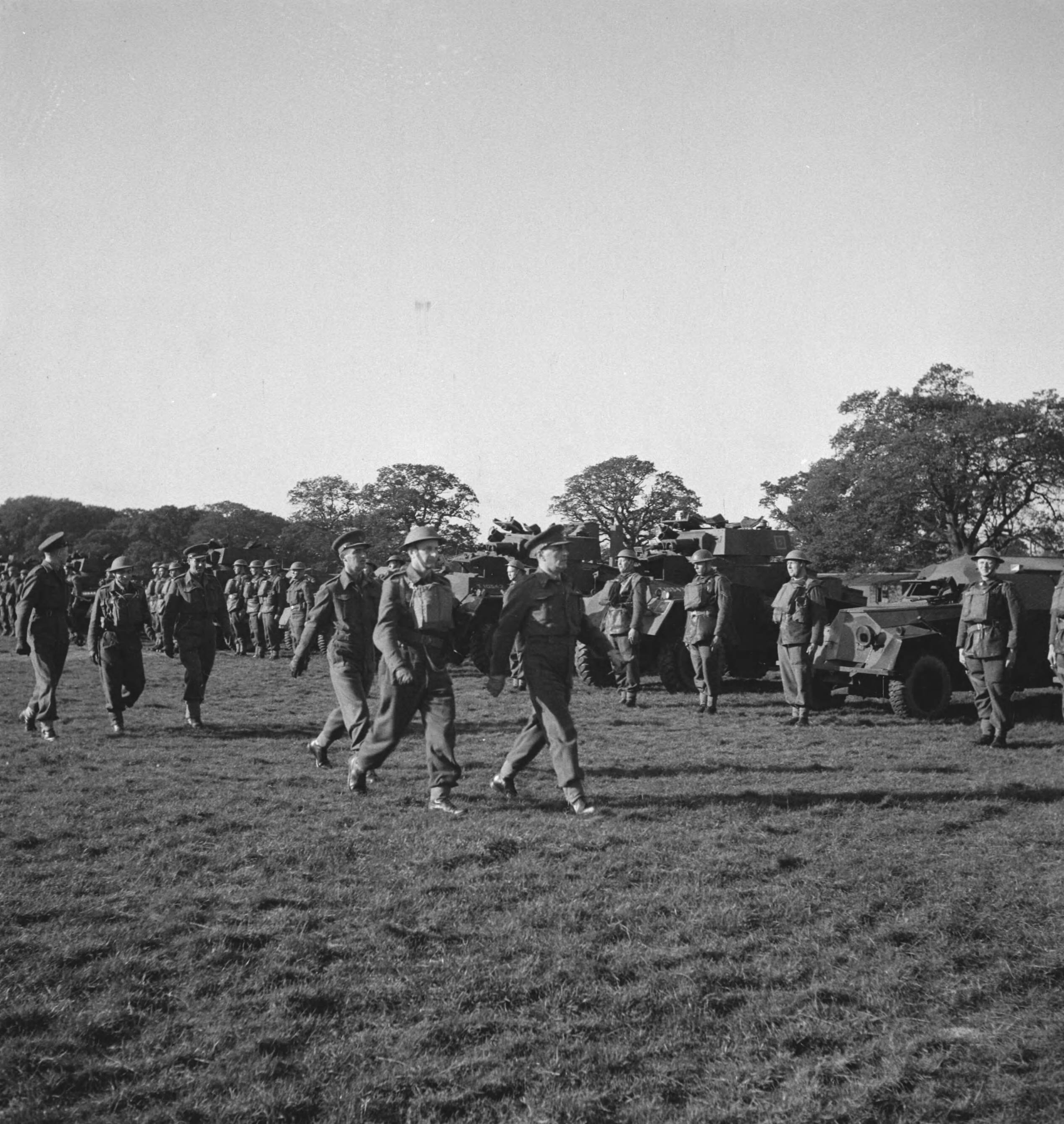 Prinses Irene Brigade. "68. Inspection of armoured cars by col. Van Voorst Evelink". Inspectie van pantservoertuigen door kolonel Van Voorst Evelink.