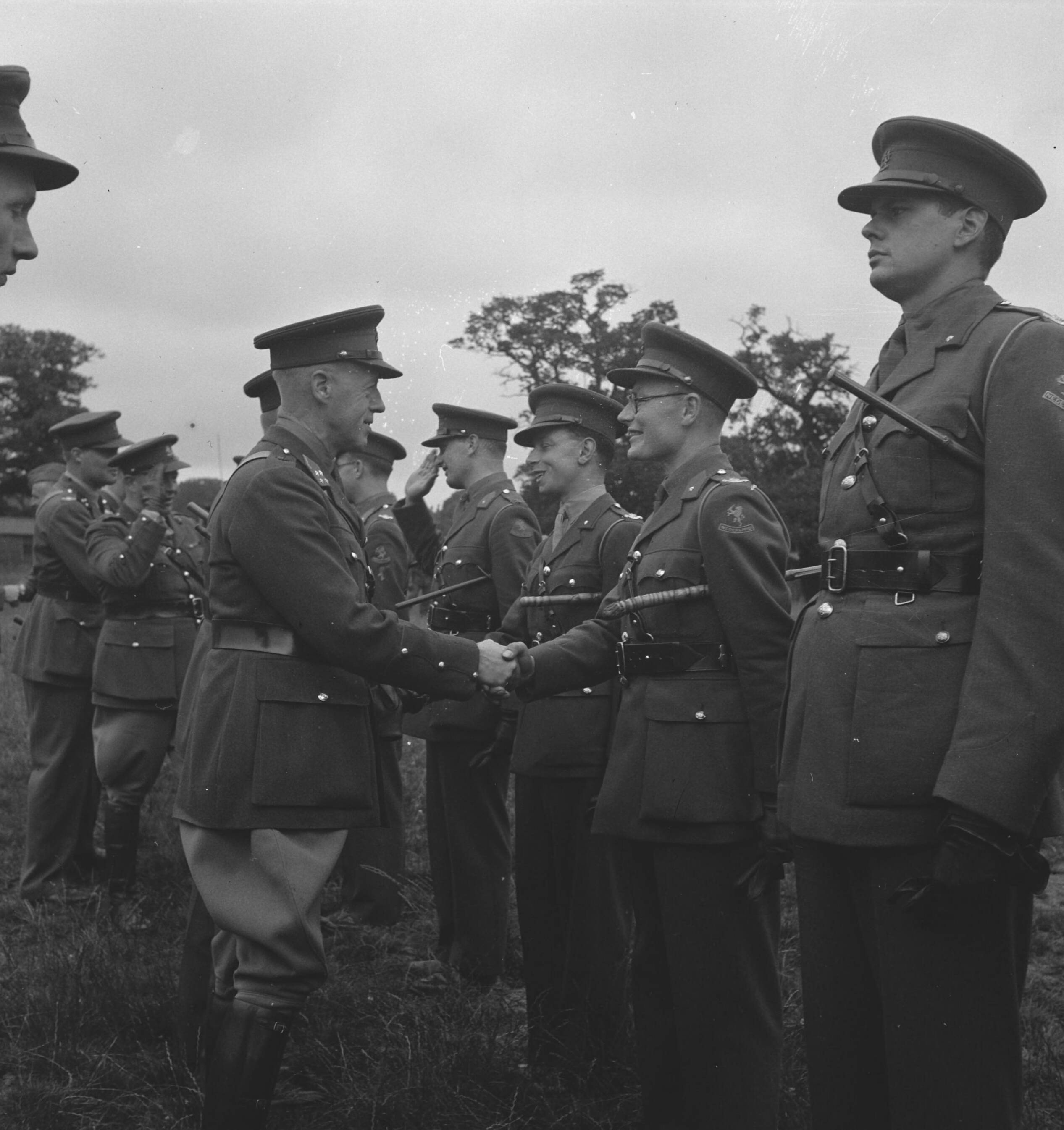 Prinses Irene Brigade."42. New officers bein congratulated by Gen. Phaff on receiving their commissions Nieuwe officieren worden gefeliciteerd door generaal Phaff met hun benoemingen