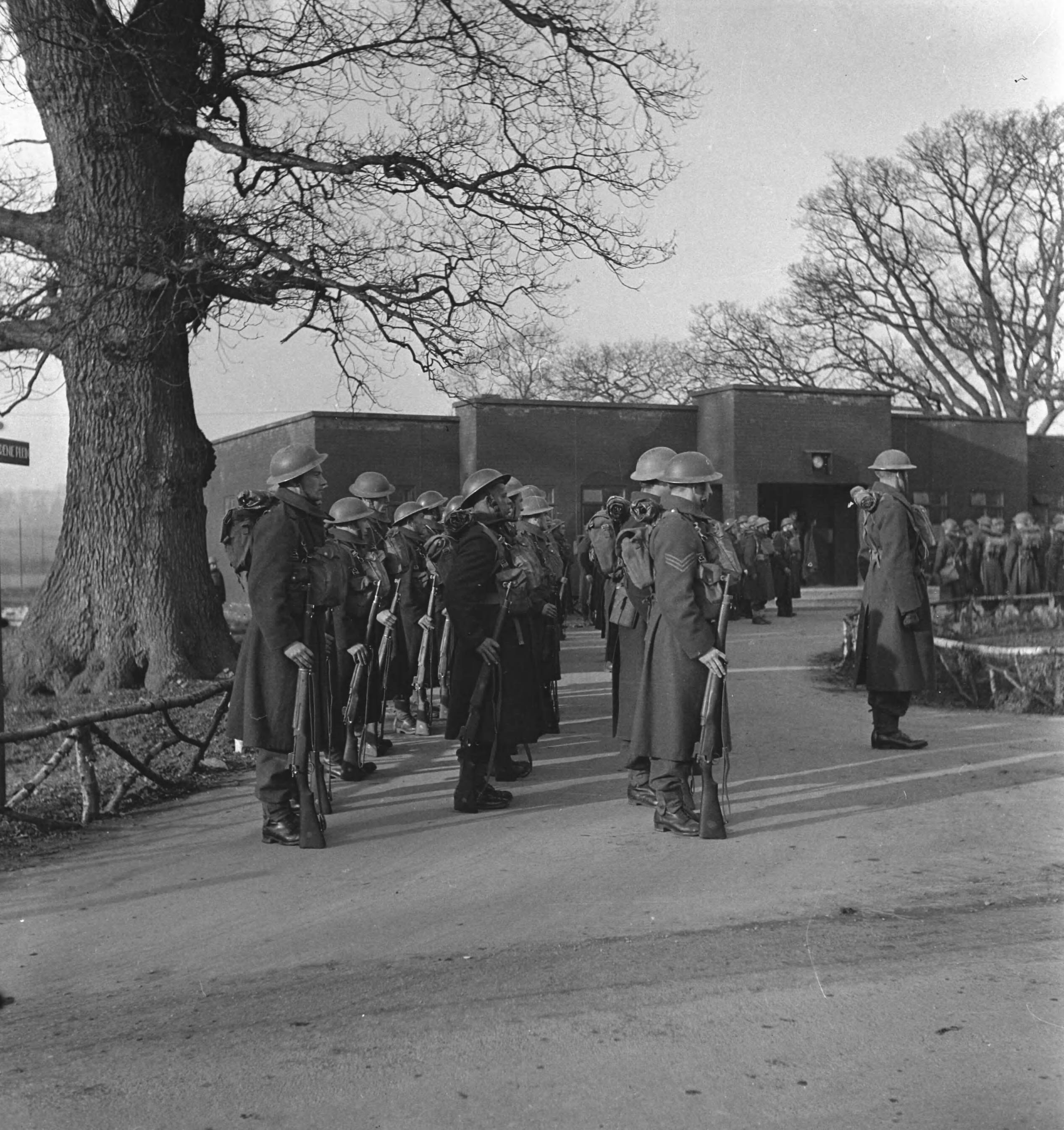 Prinses Irene Brigade: "1. Troops, who are leaving for the Netherlands Indies, waiting for the colours to be brought out". Manschappen die zullen vertrekken naar Nederlands-Indië wachten op het vaandel wat naar buiten gebracht zal worden.