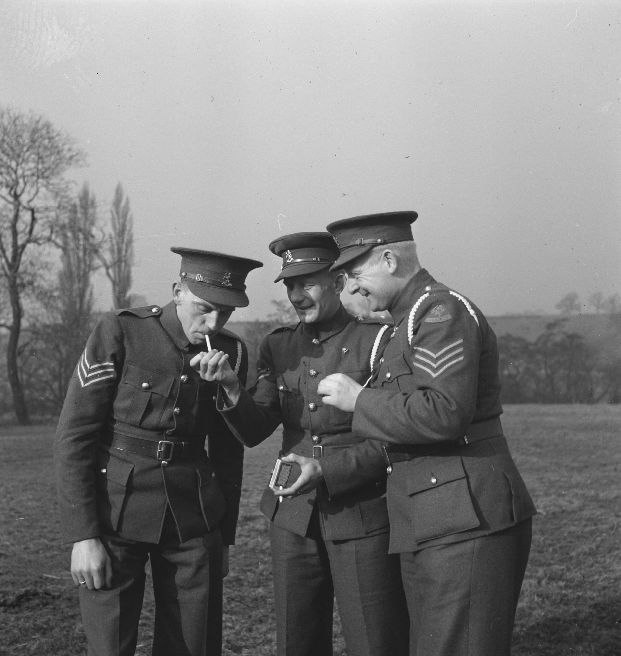 Prinses Irene Brigade in training in een kamp in de Midlands. Drie sergeanten van de militaire politie