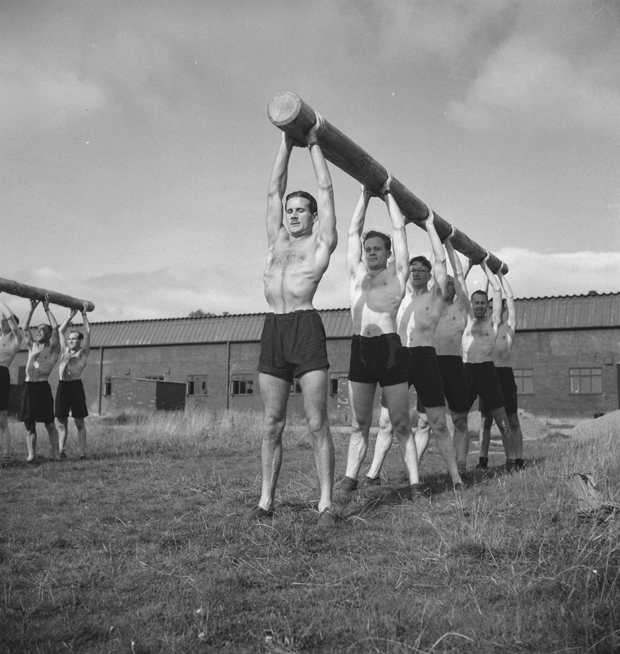 Prinses Irene Brigade in training in een kamp in de Midlands. . Een van de manieren om fit te blijven mannen dragen boomstam