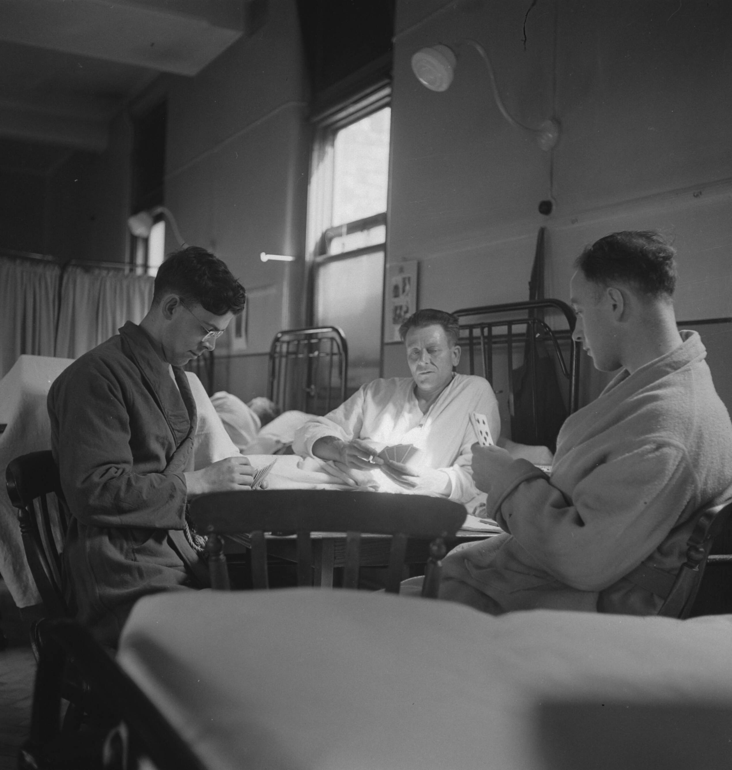 Prinses Irene Brigade in training in een kamp in de Midlands. Ziekenzaal: patiënten spelen een kaartspel