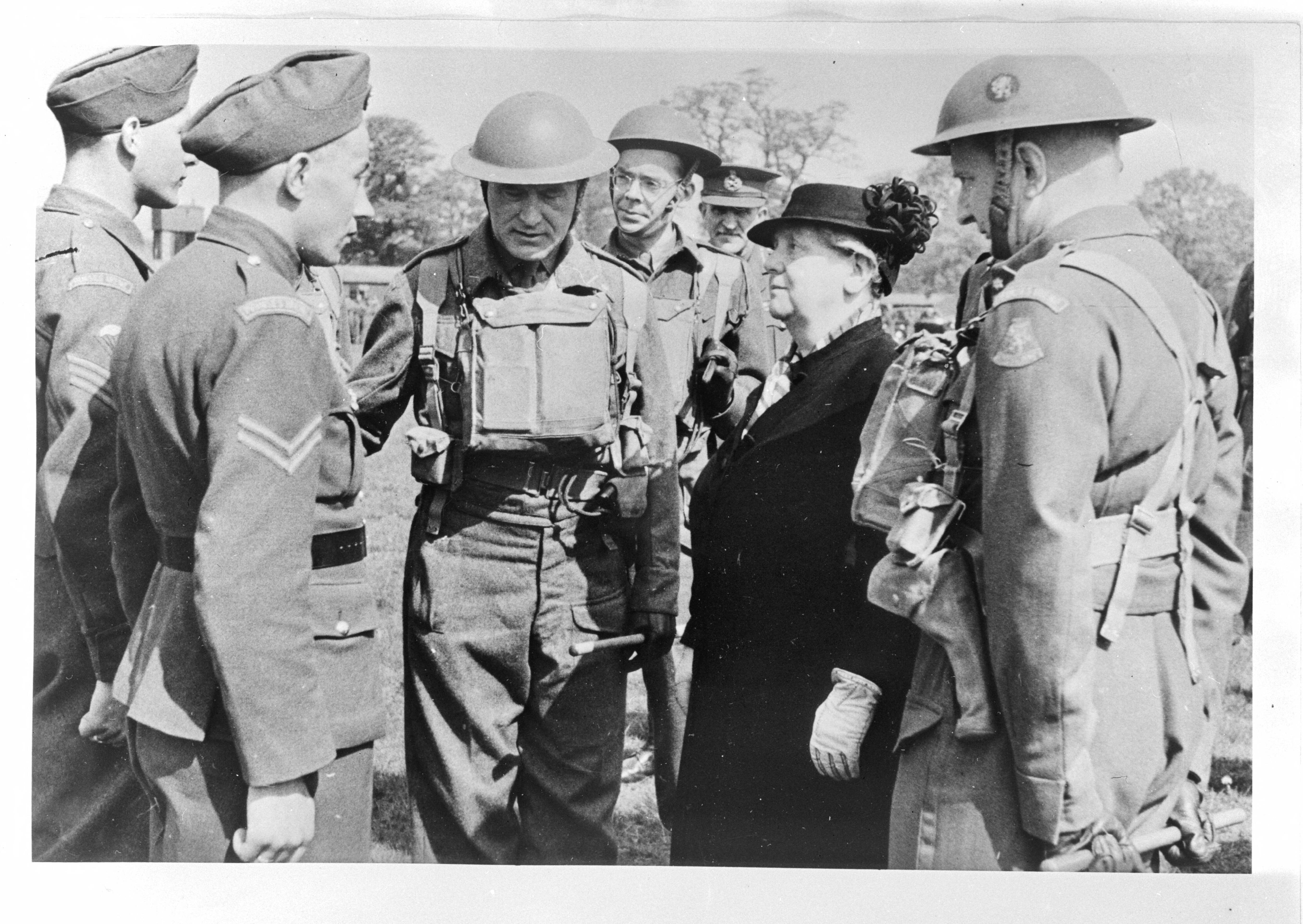 Nederlandse soldaten in training, koningin Wilhelmina in gesprek met manschappen van de Prinses Irene Brigade tijdens haar bezoek aan het militaire kamp in Wolverhampton