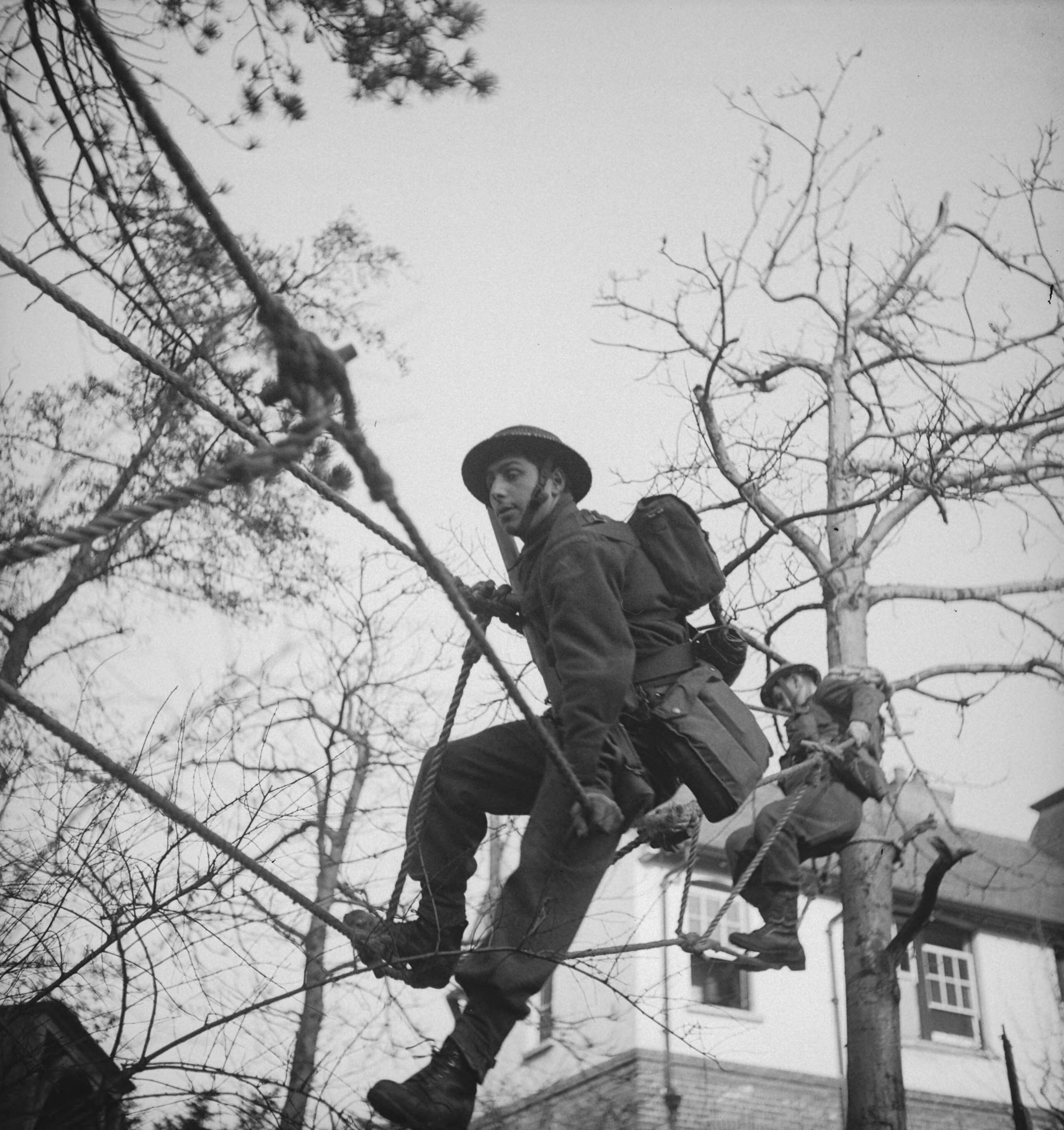 Prinses Irene Brigade. Nederlandse soldaten in training. "Dutch troop'invasion exercises" soldaten op touwbrug