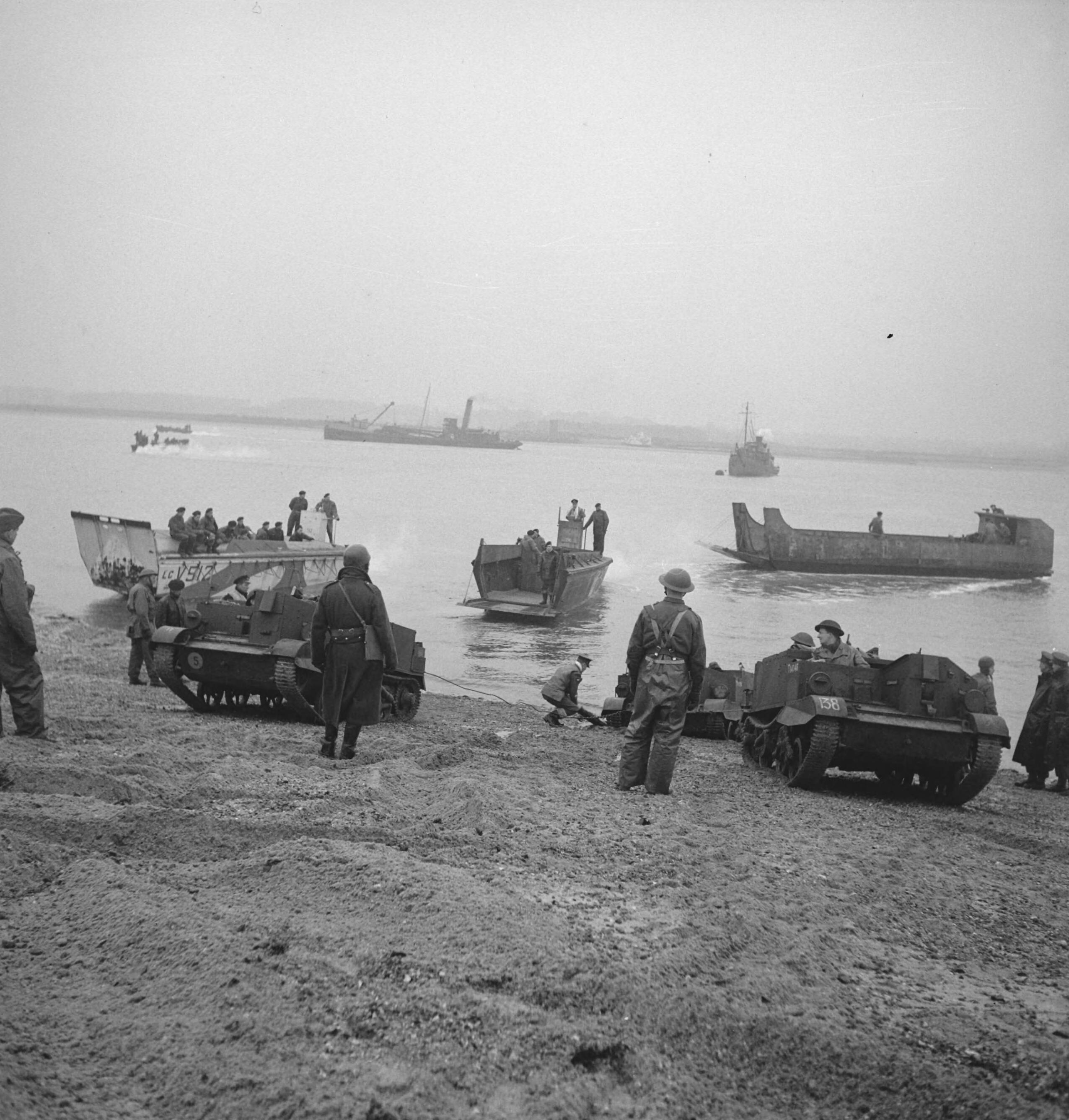 Prinses Irene Brigade. Nederlandse soldaten in training. oefeningen amfibische landingsoperaties. Op de voorgrond brencarriers