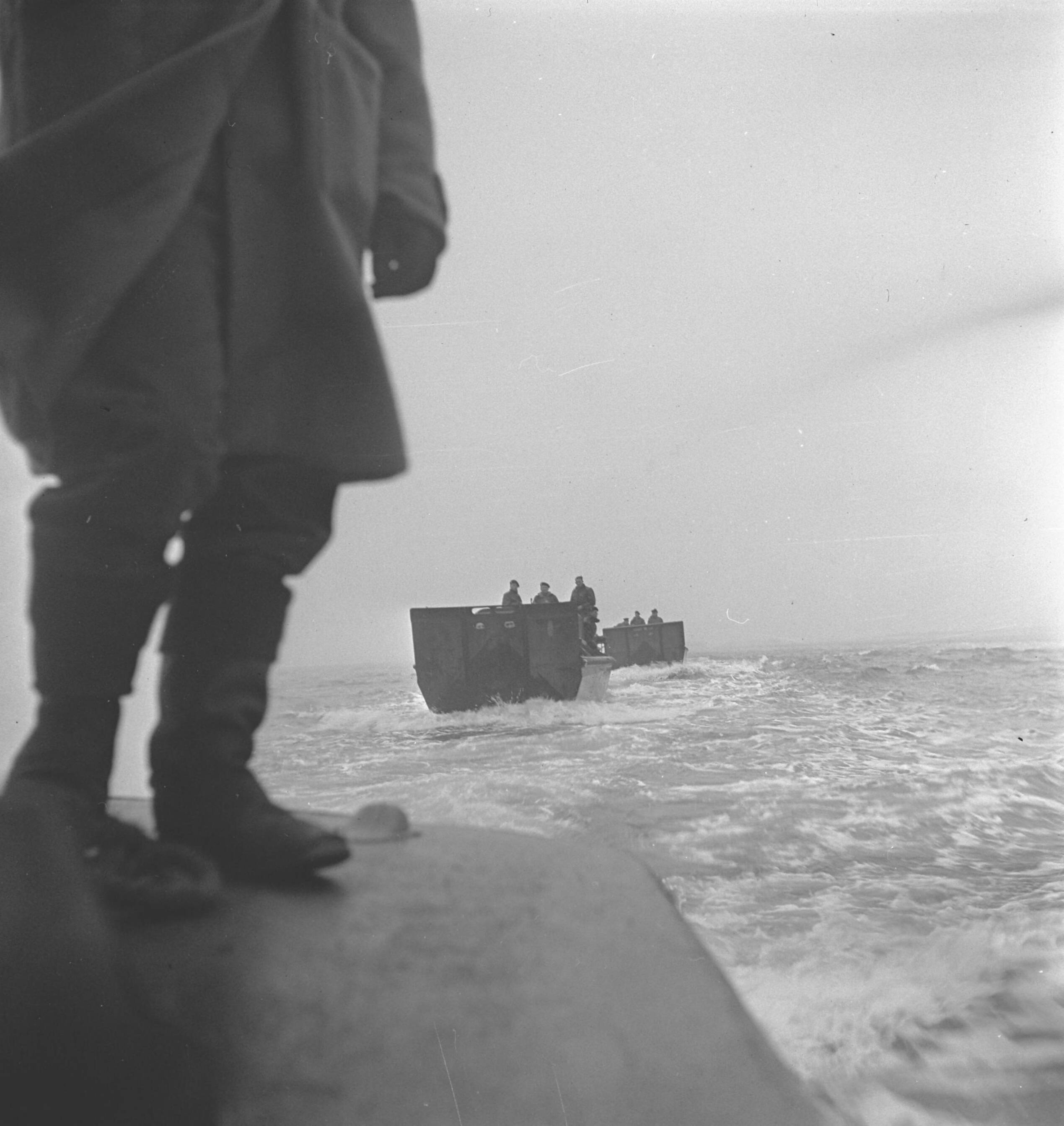 Prinses Irene Brigade. Nederlandse soldaten in training. "Dutch Forces invasion exercises". landingsboten onderweg