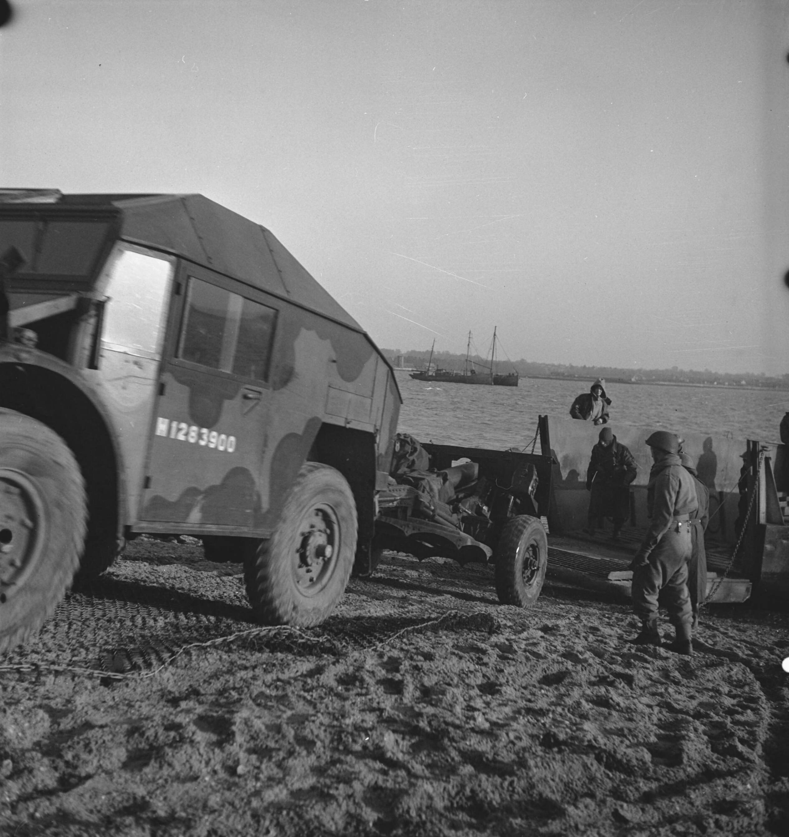 Prinses Irene Brigade. Nederlandse soldaten in training. "Dutch Forces invasion exercises".artillerietrekker met geschut verlaat landingsboot