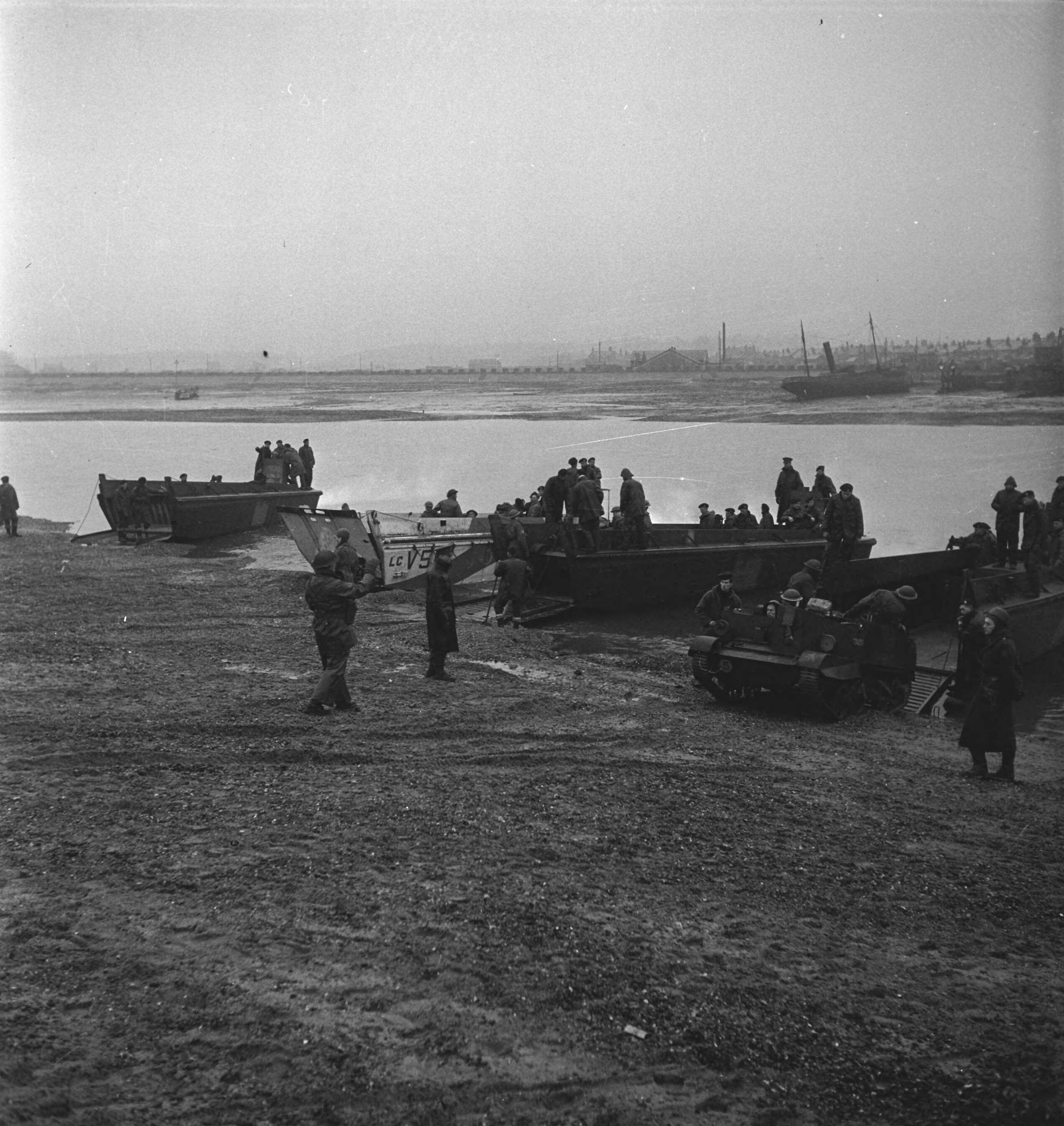 Prinses Irene Brigade. Nederlandse soldaten in training. "Dutch Forces invasion exercises diverse landingsboten aan strand