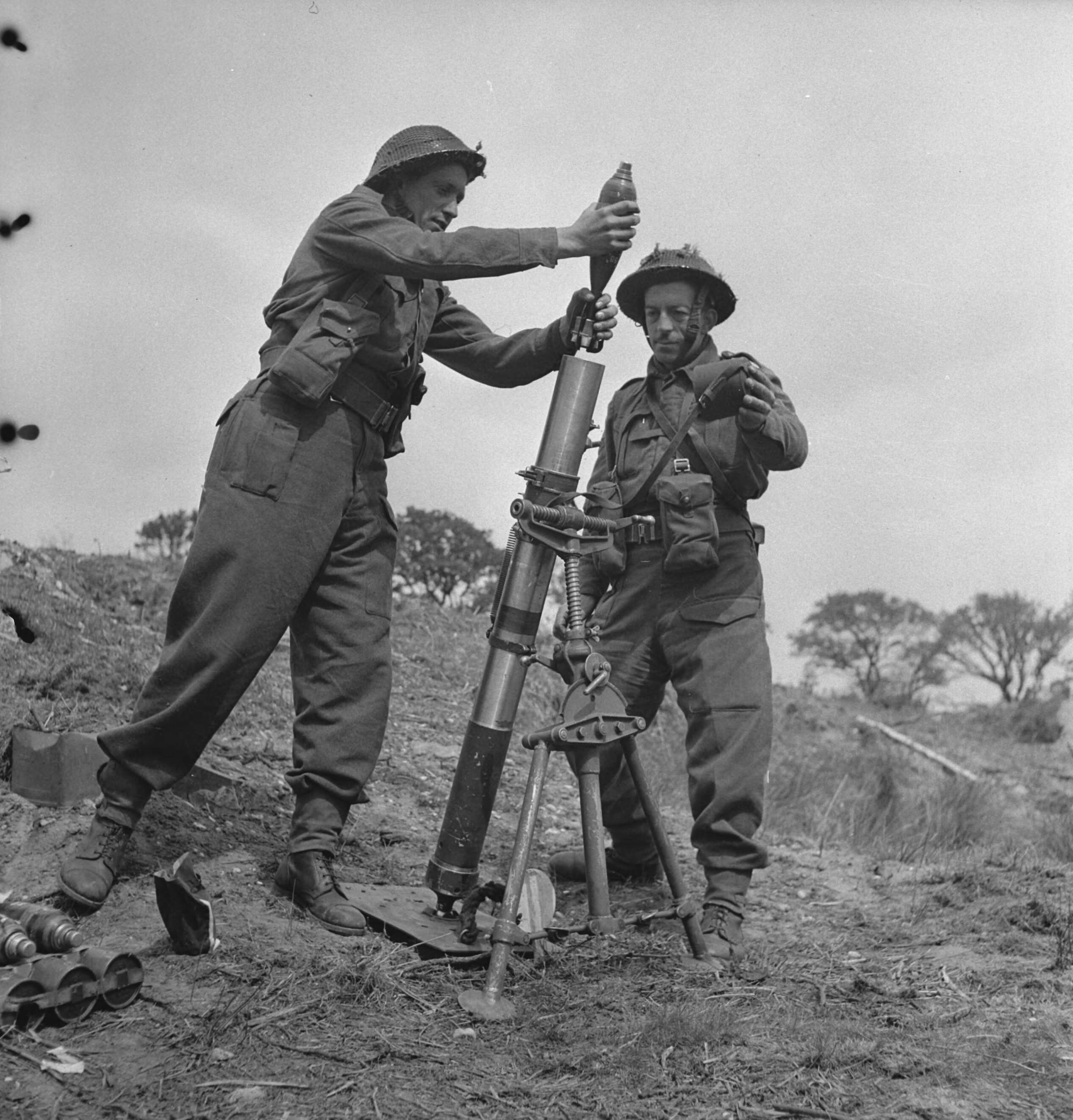 Koninklijke Nederlandse Brigade Prinses Irene in training. Mortierschutters met een 3" mortier