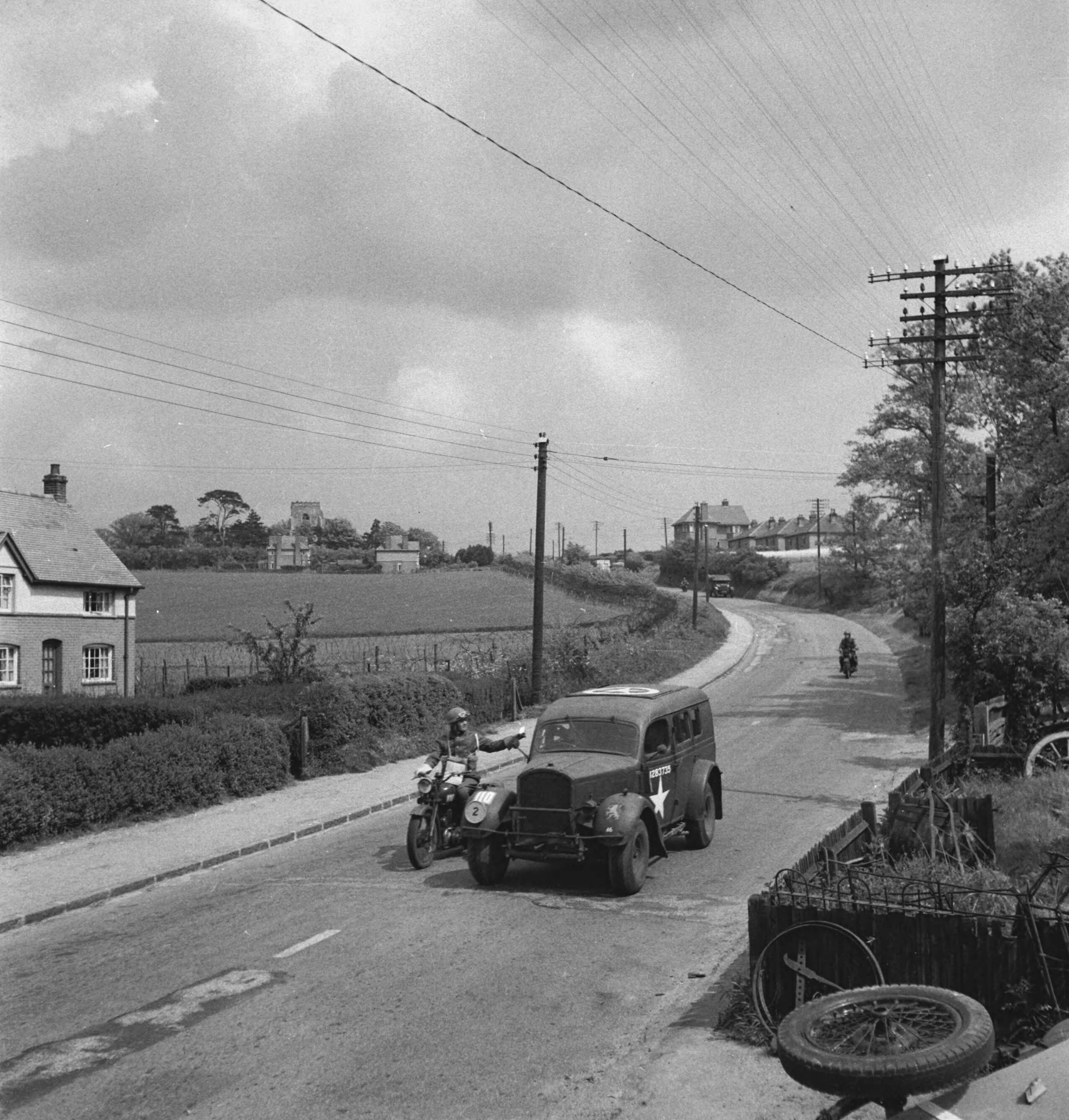 Koninklijke Nederlandse Brigade Prinses Irene in training. Motorordonnans geeft bericht af aan stafauto