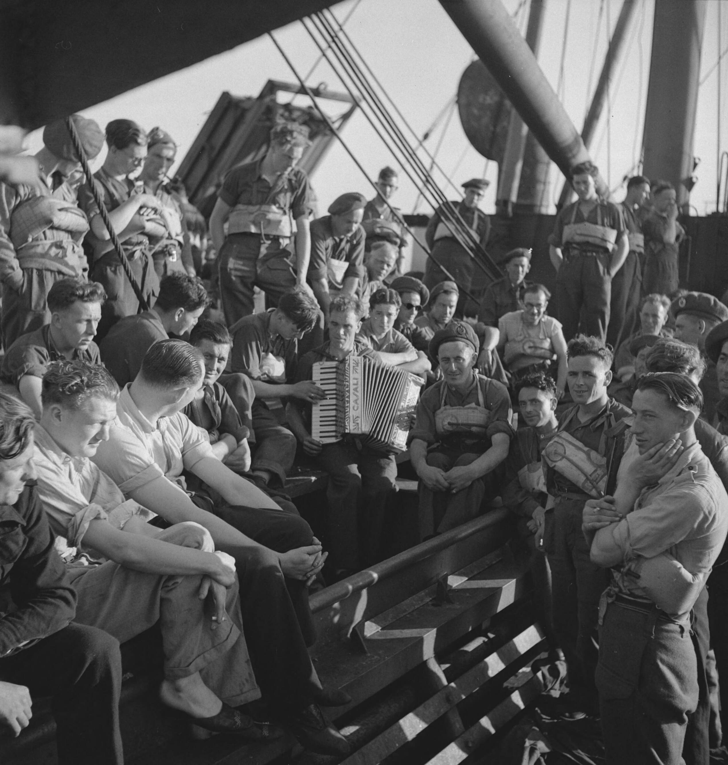 Koninklijke Nederlandse Brigade Prinses Irene. Landing in Normandië. Manschappen op schip voor de landing
