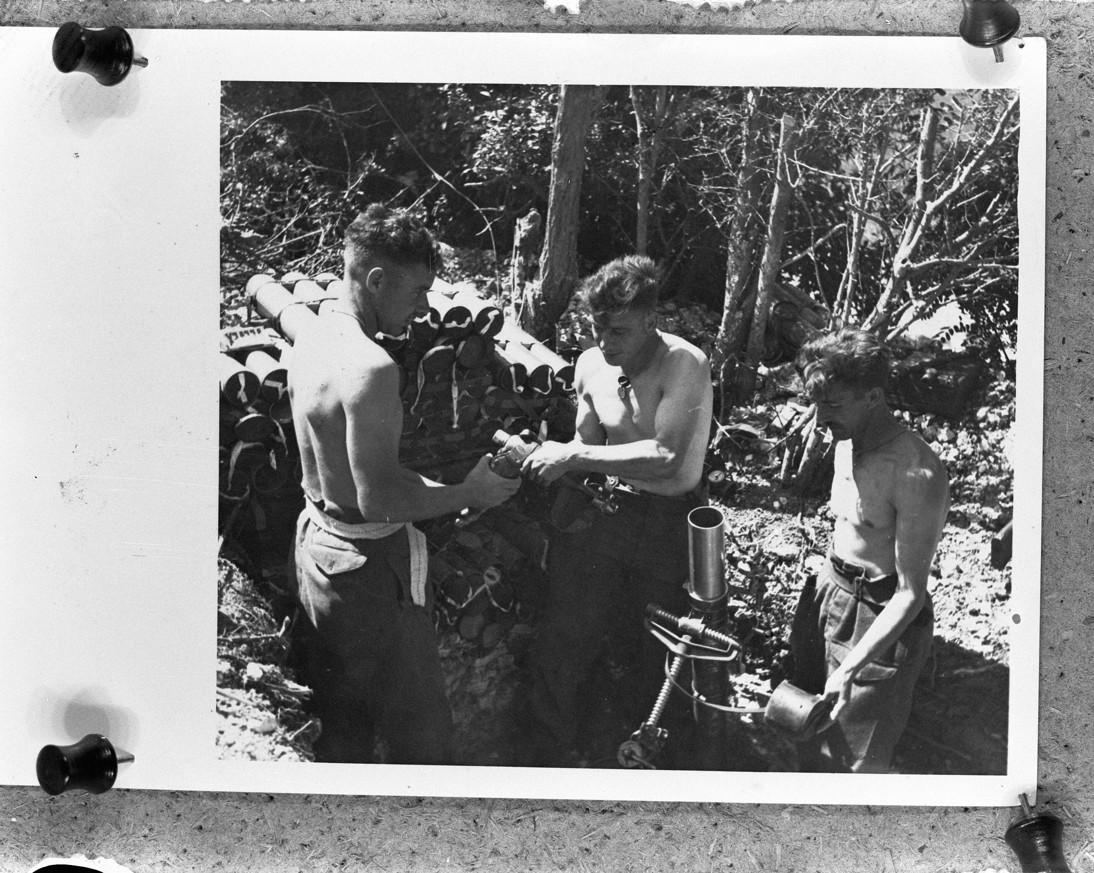 Koninklijke Nederlandse Brigade Prinses Irene. Normandië. 3" mortier wordt afgevuurd