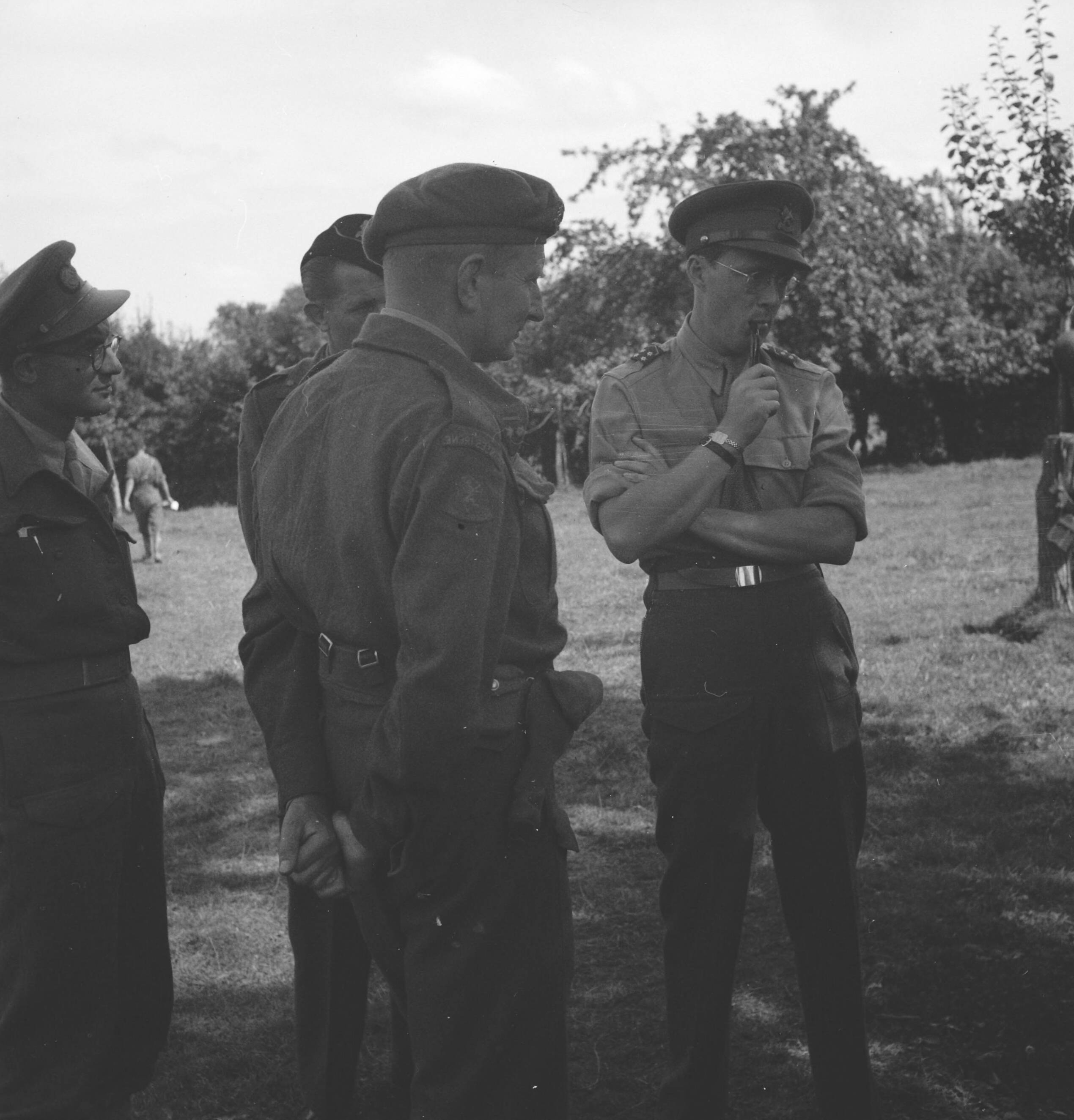 Koninklijke Nederlandse Brigade Prinses Irene. Orne sector officieren in beraad met Prins Bernhard