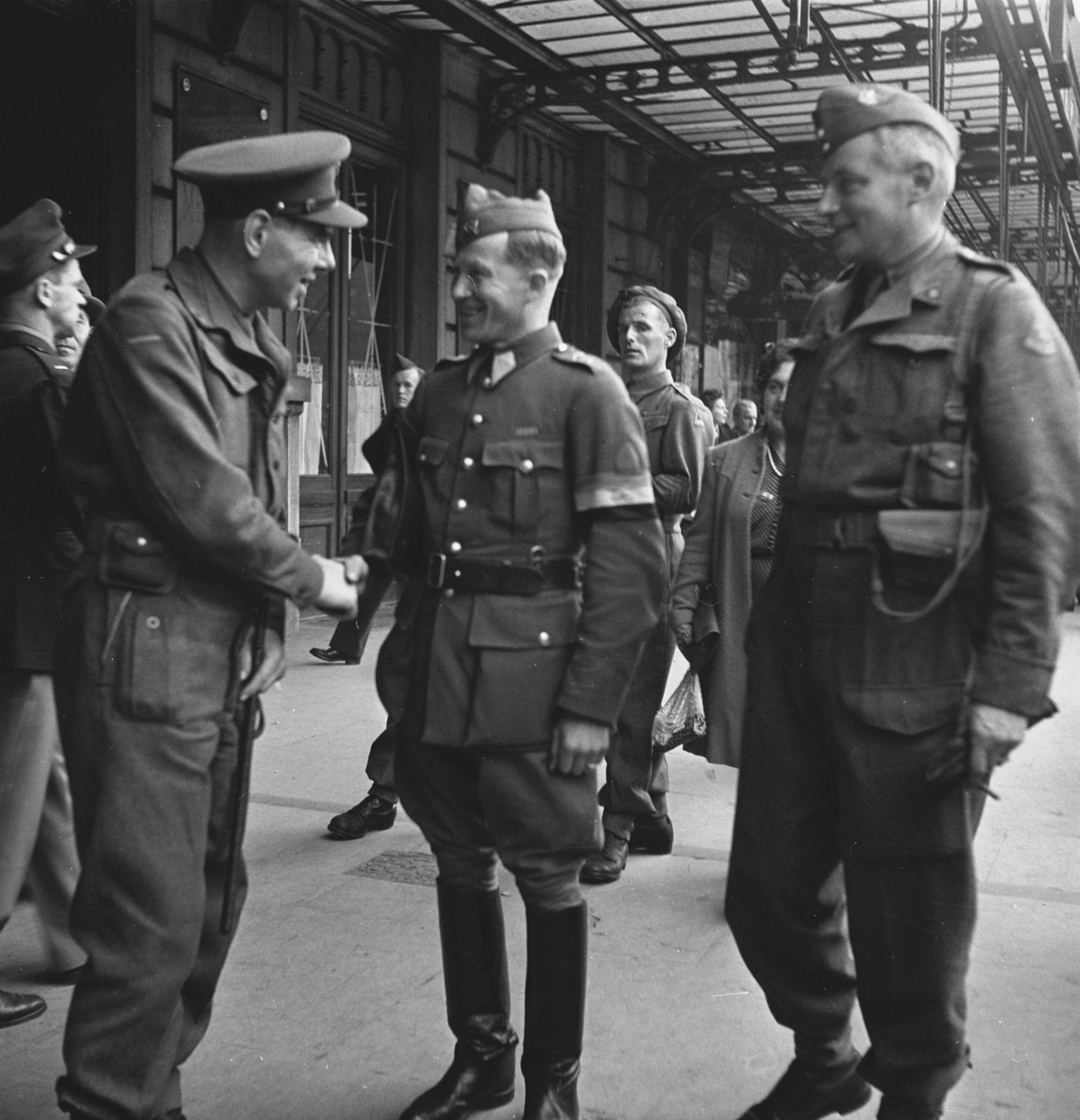 Prinses Irene Brigade in België. Brussel. Nederlands officier begroet door Belgische collega's