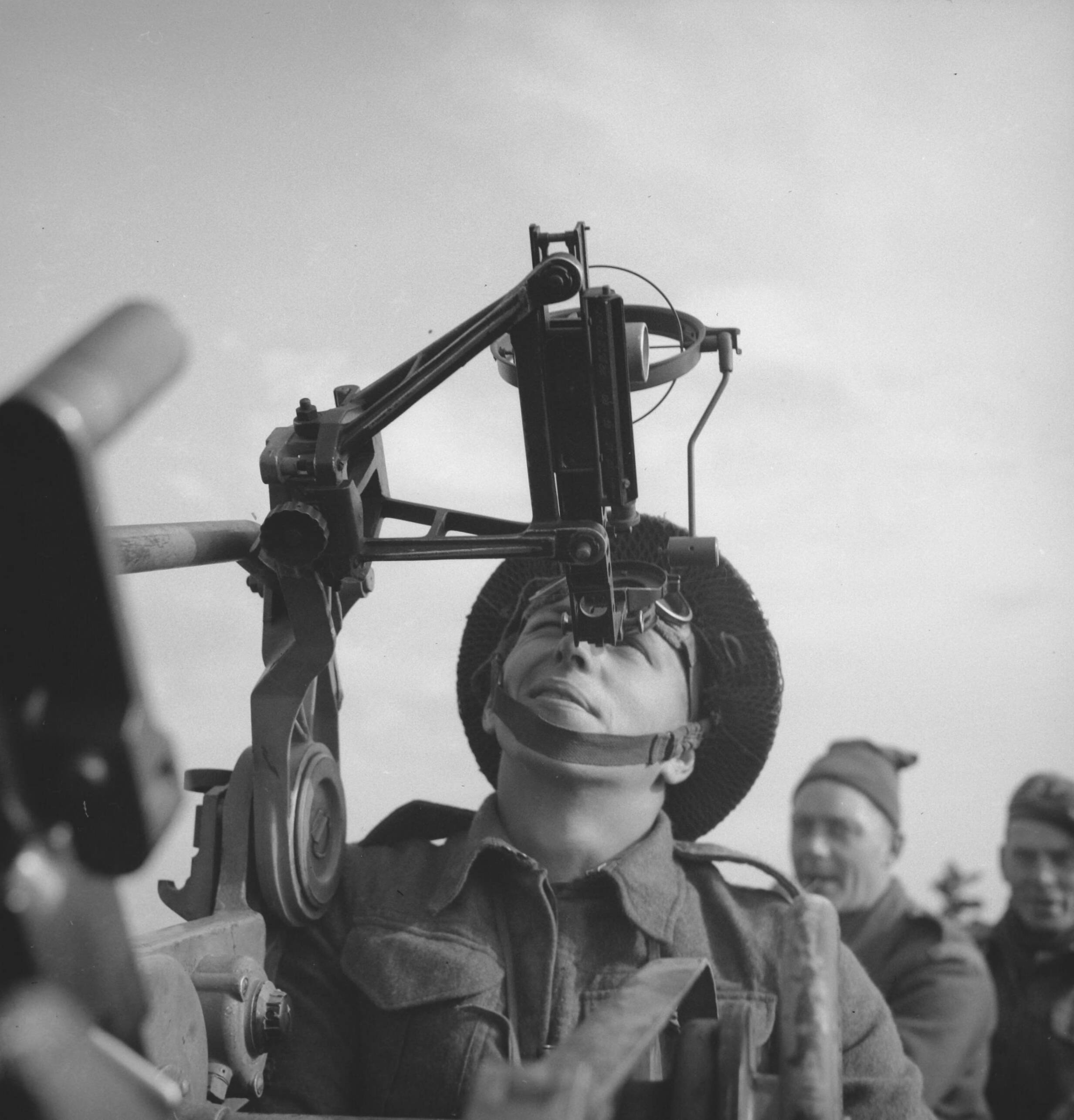 Prinses Irene Brigade in Nederland soldaat kijkt door vizier van luchtafweergeschut