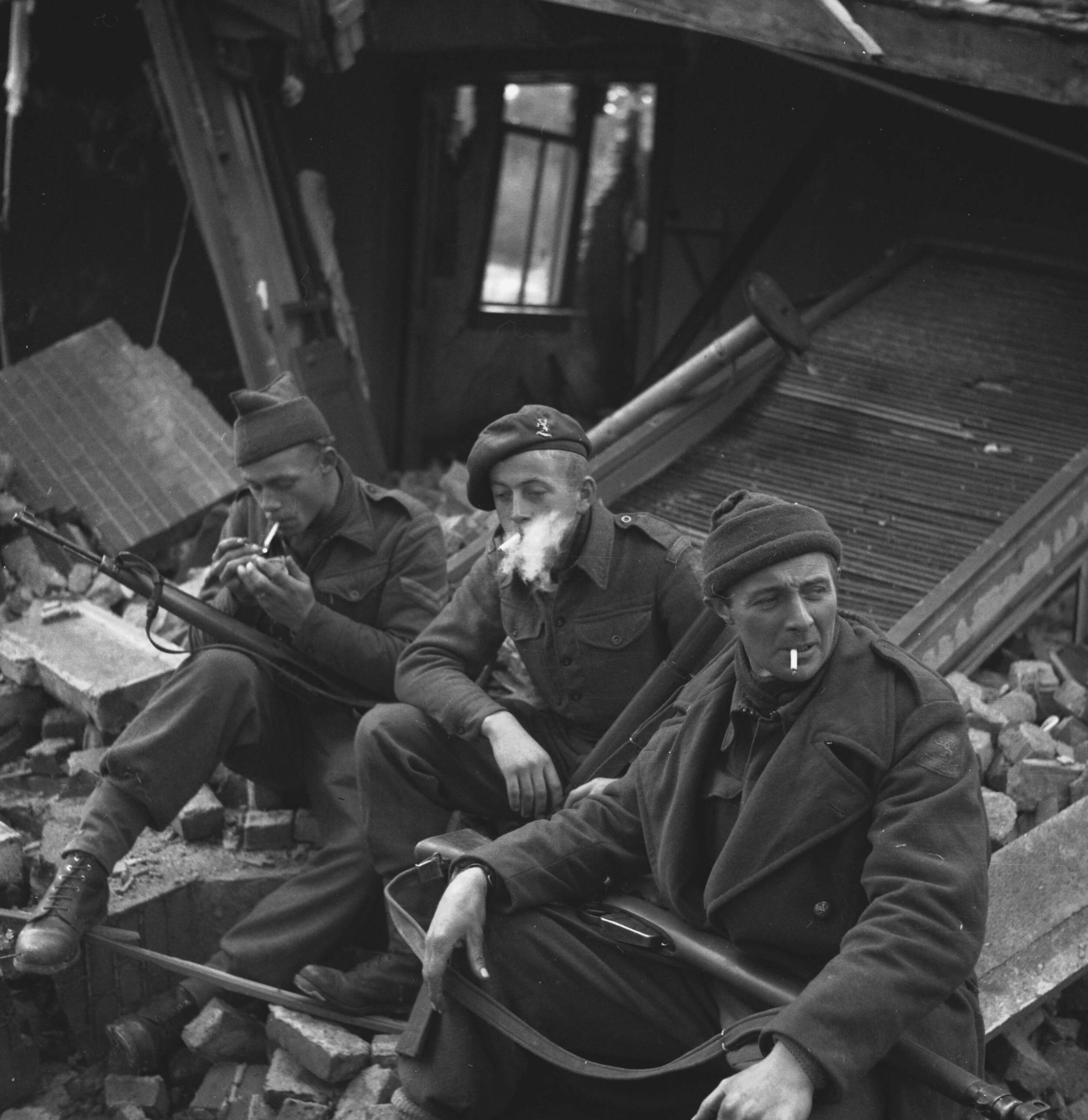 Koninkijke Nederlandse Prinses Irene Brigade in Nederland soldaten rusten uit tijdens een gevechtspauze bij de ruïnes van een verwoest gebouw