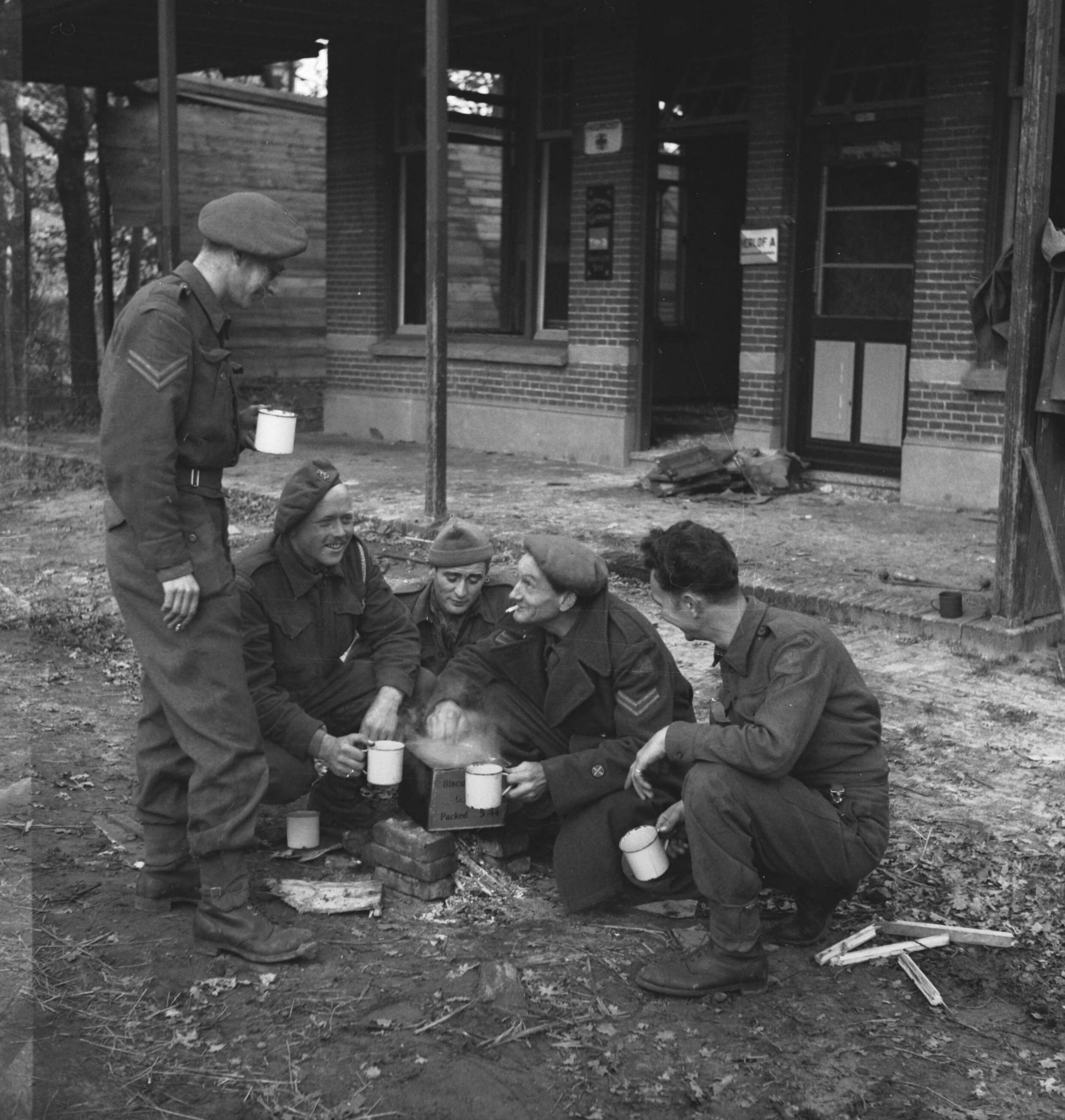 Prinses Irene Brigade in Nederland.De weg Tilburg-Breda. Soldaten drinken thee