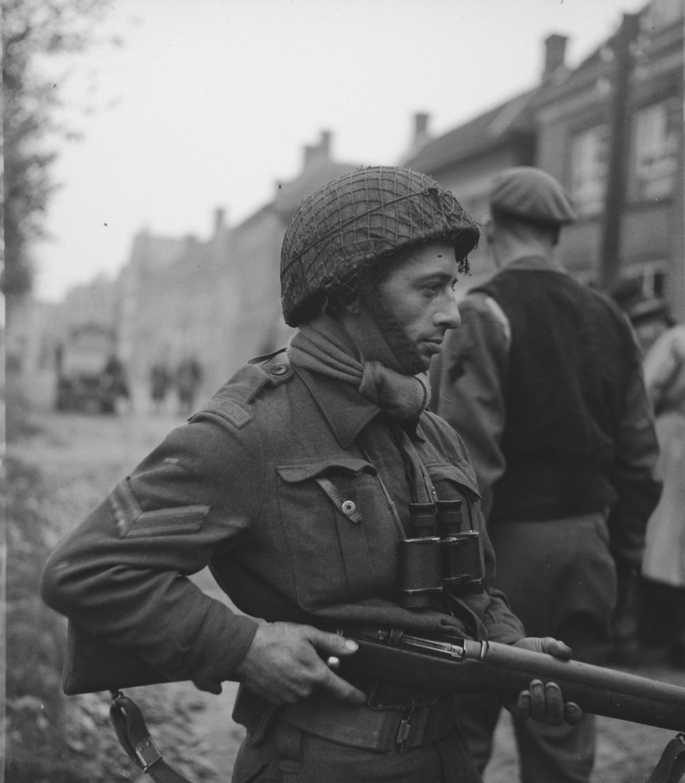 Prinses Irene Brigade in Nederland.Een soldaat 1e klasse met luchtlandingshelm