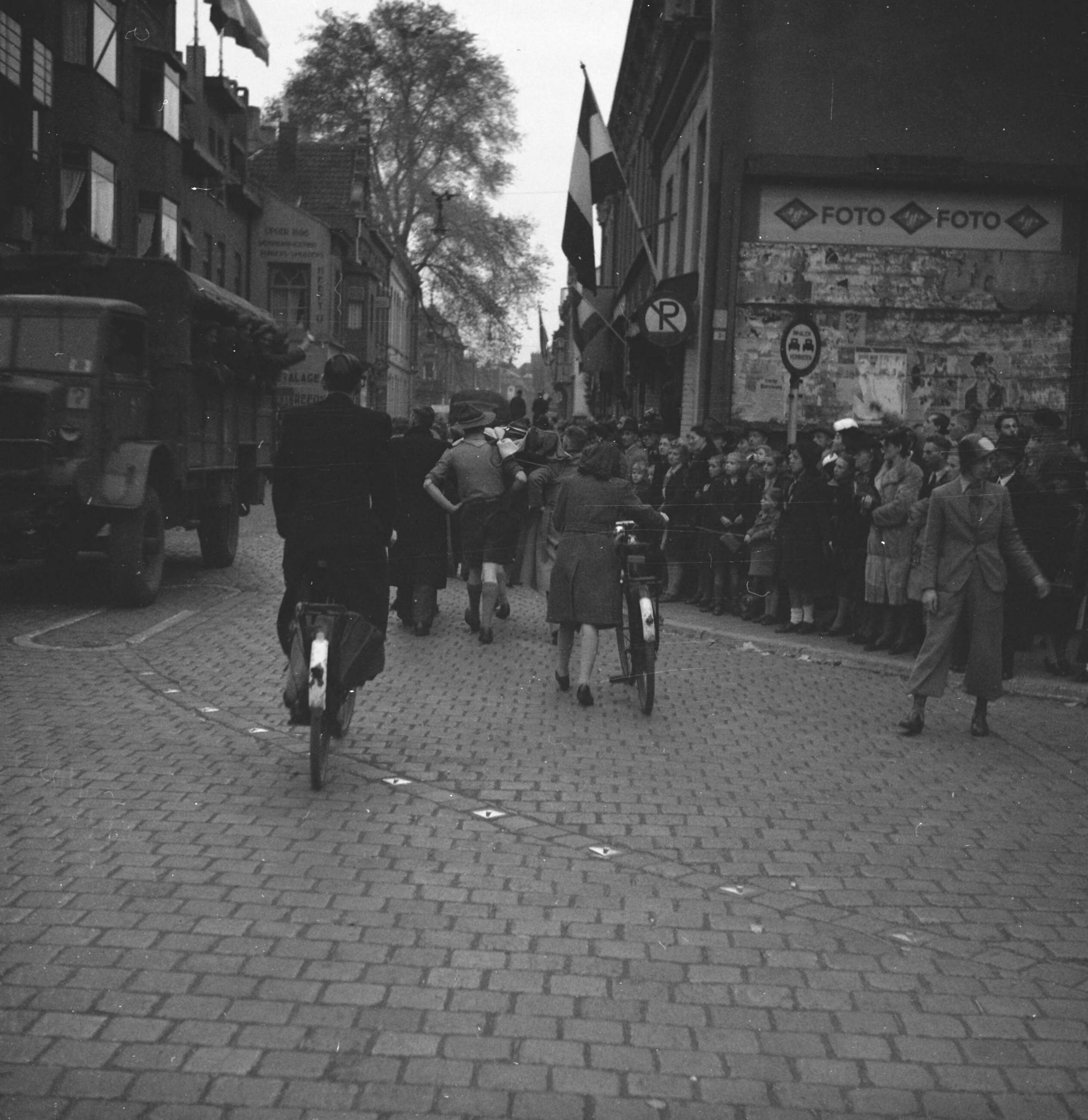Prinses Irene Brigade in Nederland. Padvinders vervoeren een gewonde per brancard in Tilburg, terwijl troepen in een vrachtwagen passeren