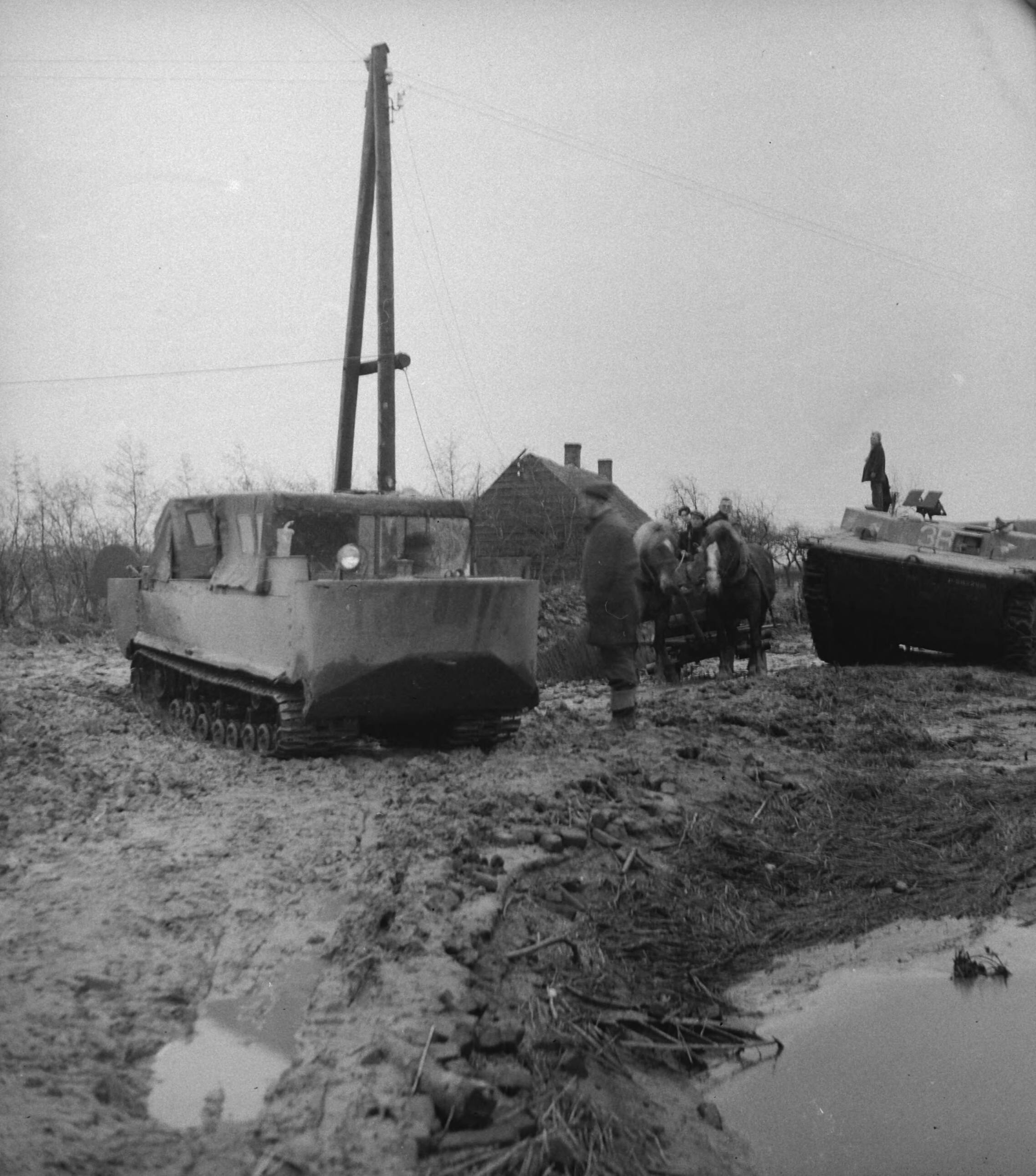 Prinses Irene Brigade in Nederland. een gestrand rupslandingsvoertuig