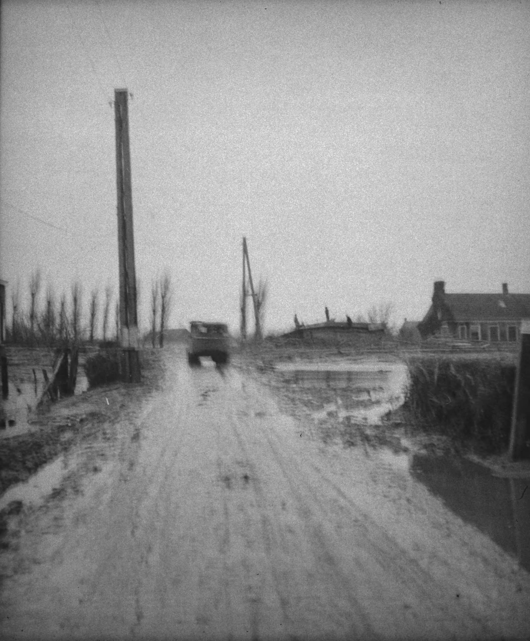 Prinses Irene Brigade in Nederland. een vrachtwagen rijdt over een weg, met aan weerszijden ondergelopen land