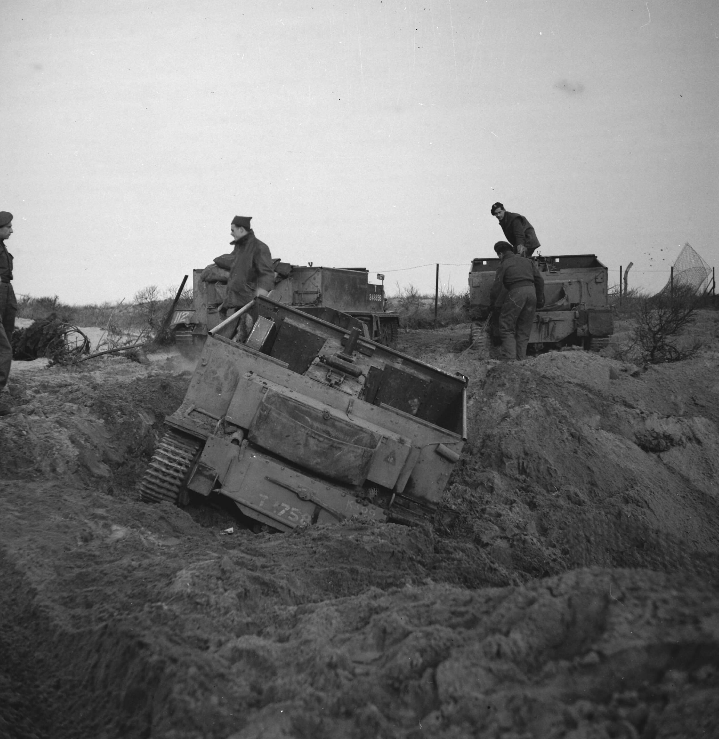 Prinses Irene Brigade in Nederland. Een Universal Carrier Bren Carrier is vastgelopen in een duingebied