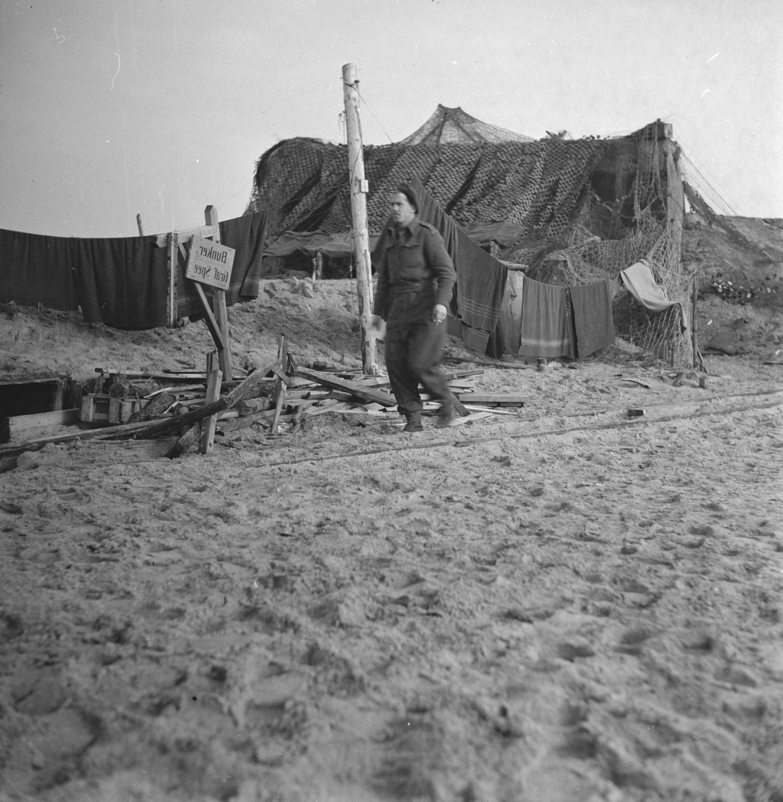 Prinses Irene Brigade in Nederland. Soldaten slapen in door Duitsers in de duinen gebouwde bunkers