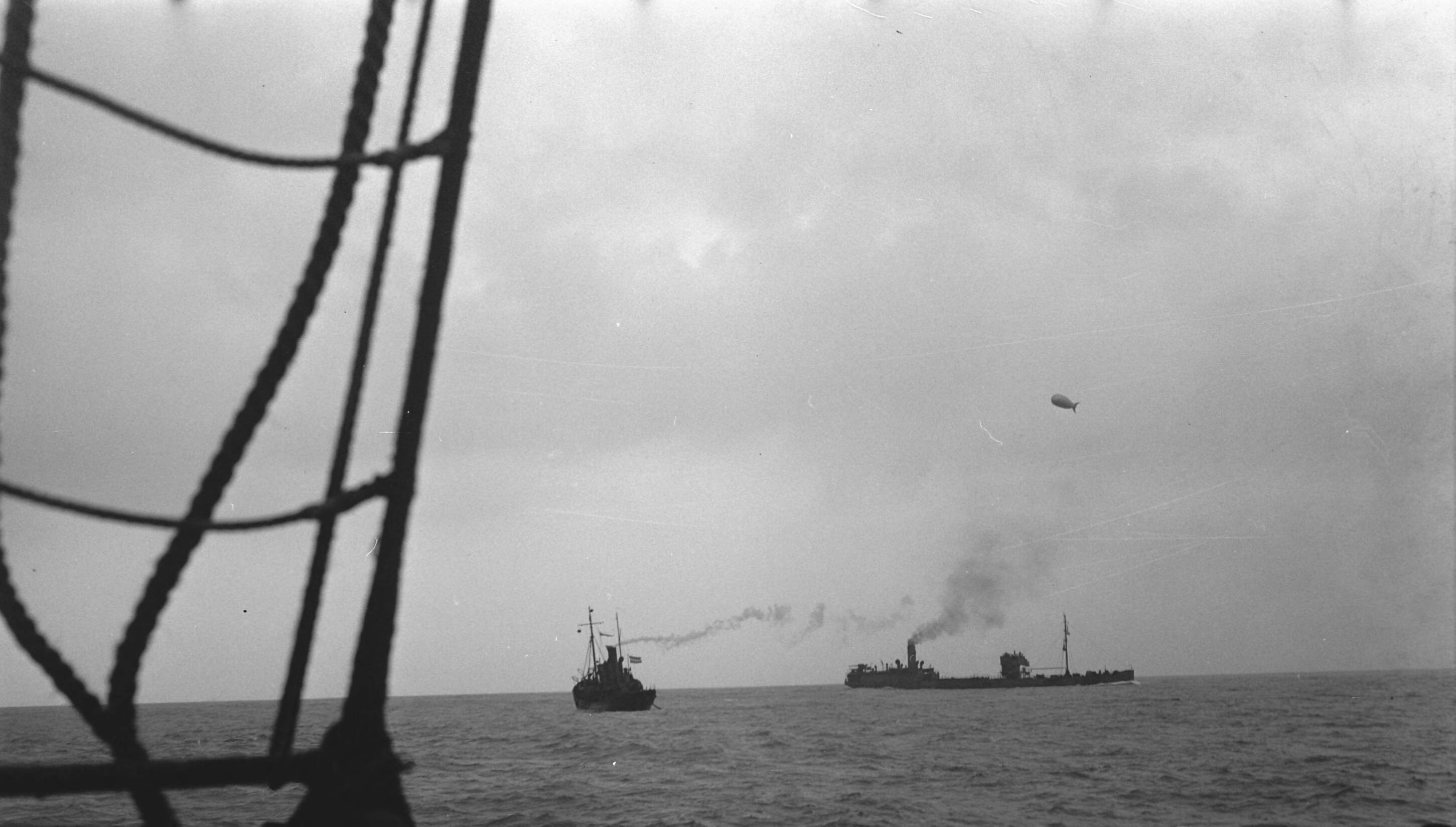 Nederlandse mijnenvegers. Boven een mijnenveger een luchtbeschermingsballon