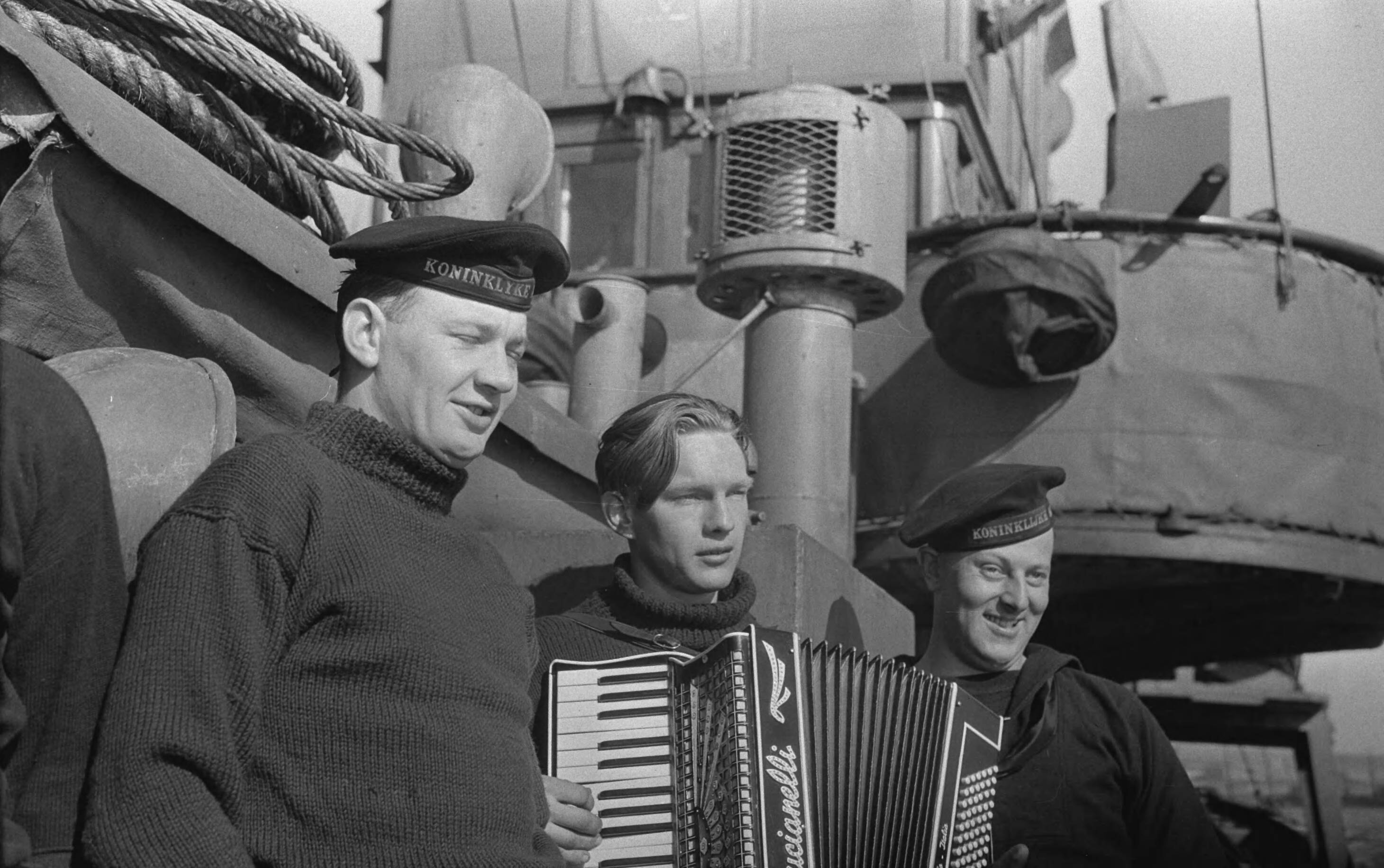 Bemanningsleden van een Nederlandse mijnenveger, voormalige opvarenden van de visserijvloot. Mannen vermaken zich met accordeonmuziek