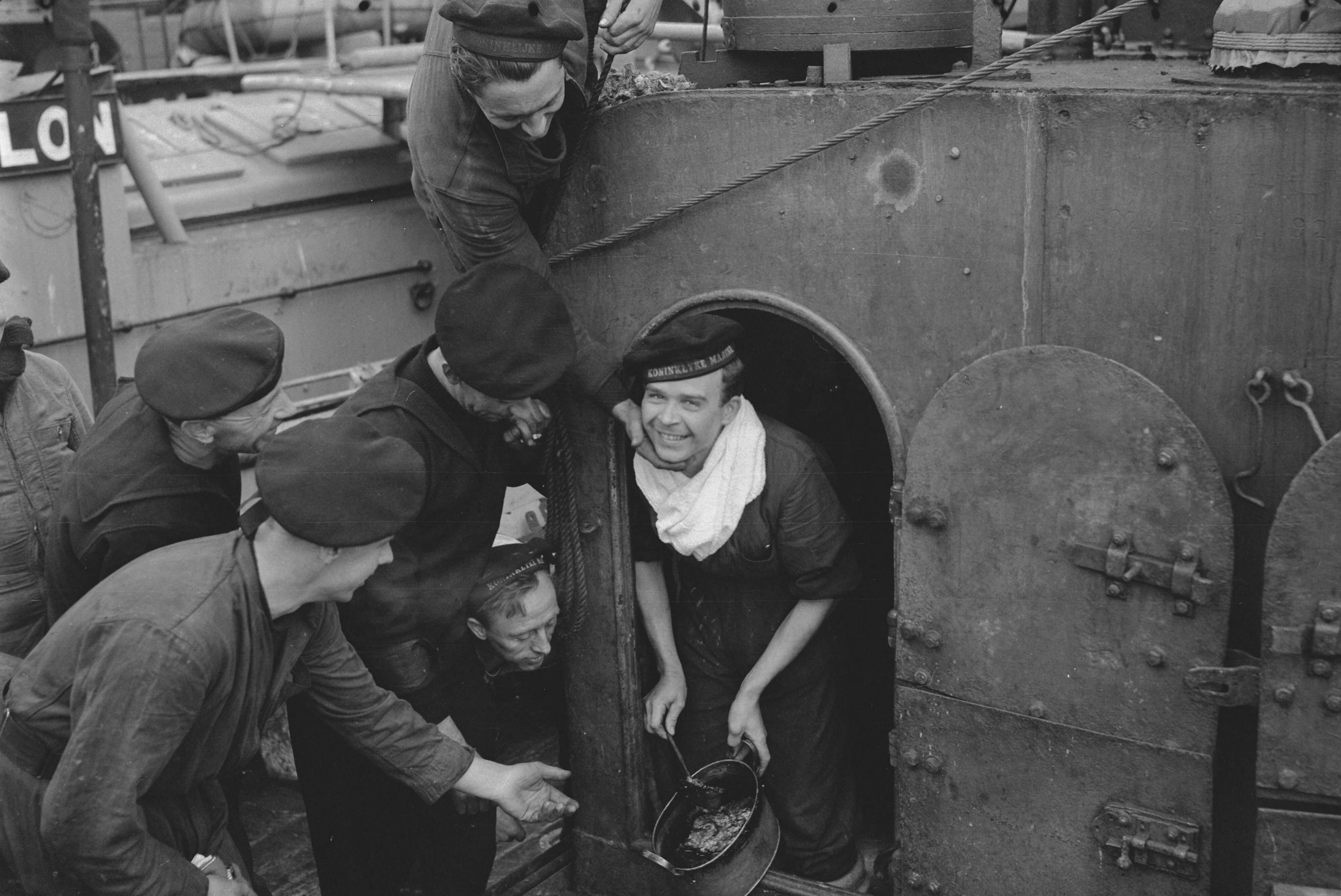 Bemanningsleden van een Nederlandse mijnenveger, voormalige opvarenden van de visserijvloot. Nederlandse mijnenveger Hr. Ms.