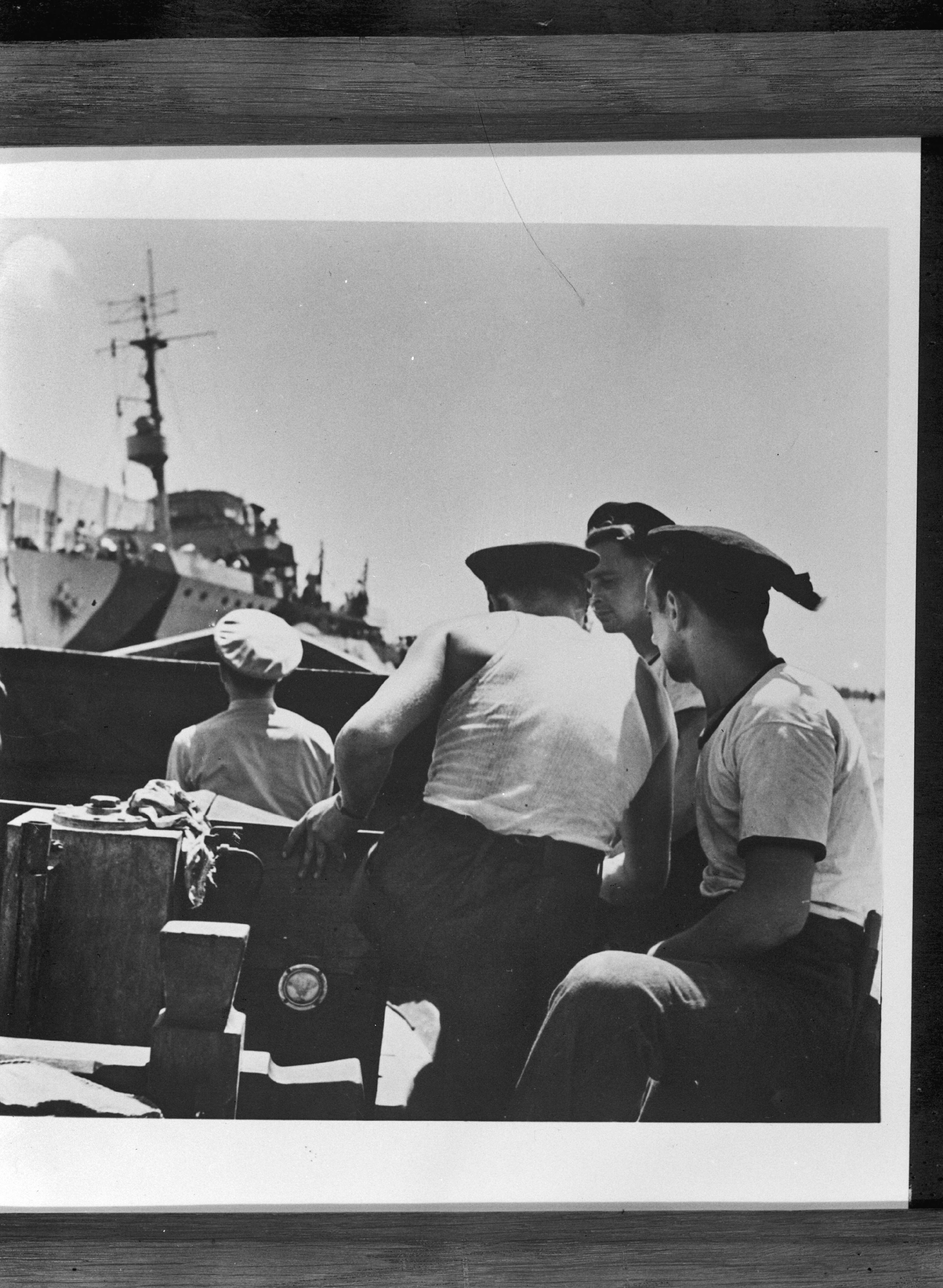 Hr. Ms. Jan van Brakel in Amerikaanse haven. Slopen met matrozen nadert schip