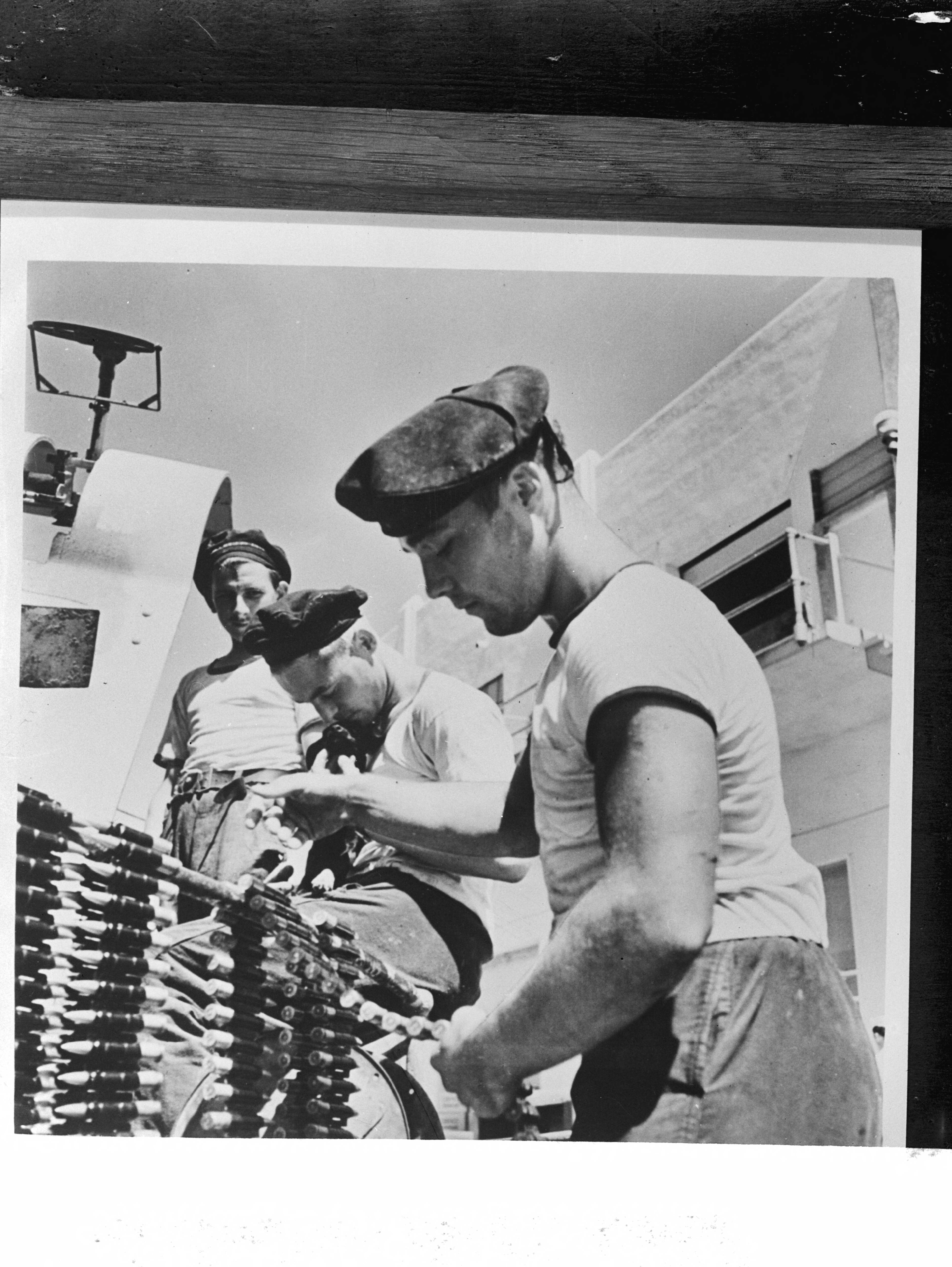 Luchtafweergeschut op Hr. Ms. Jan van Brakel. Bemanningsleden maken het wapen schoon