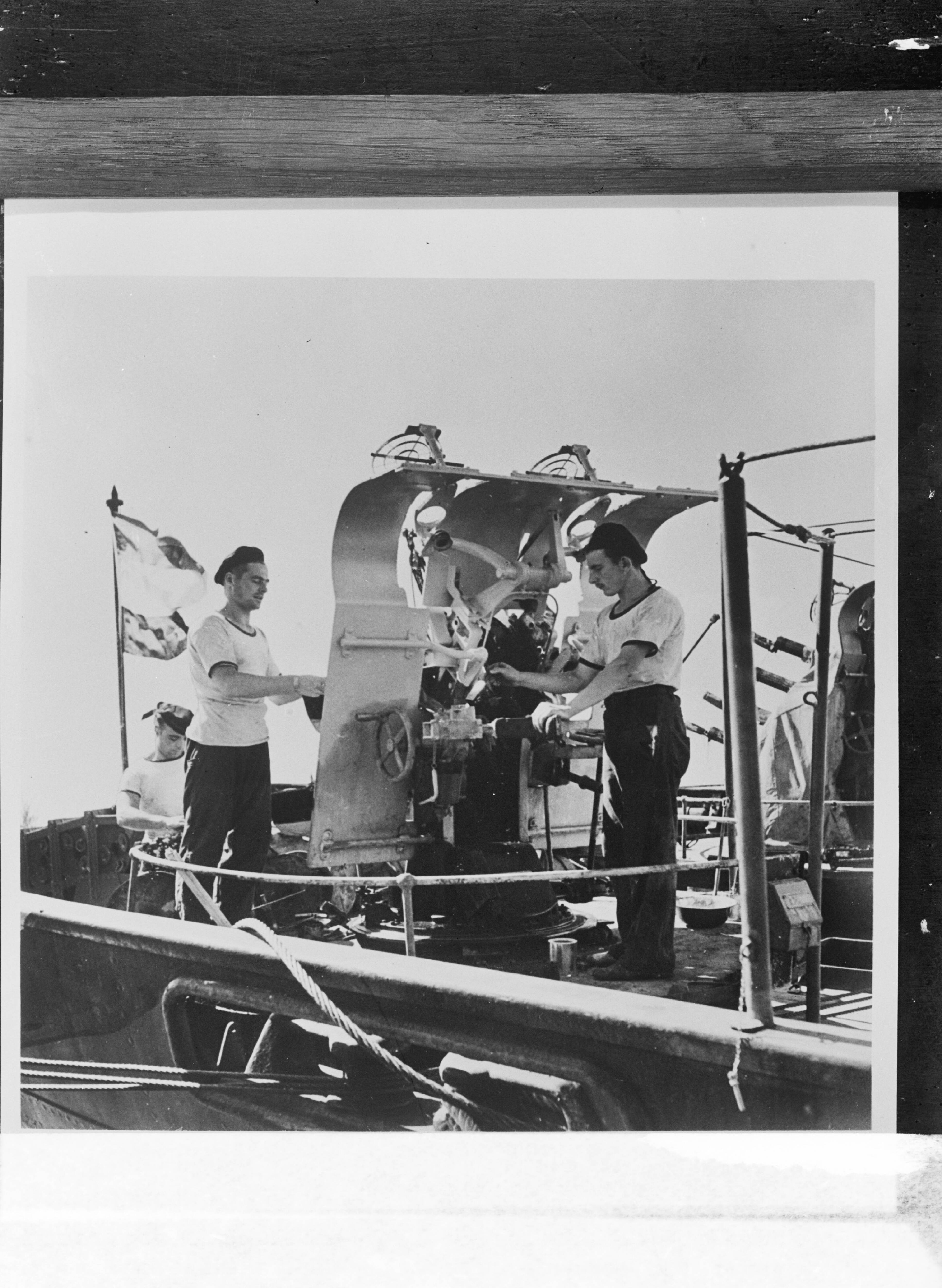 Luchtafweergeschut op Hr. Ms. Jan van Brakel. Bemanningsleden maken het wapen schoon