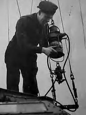 Serie: aan boord van een Nederlandse torpedobootjager. Een matroos controleert de verlichting