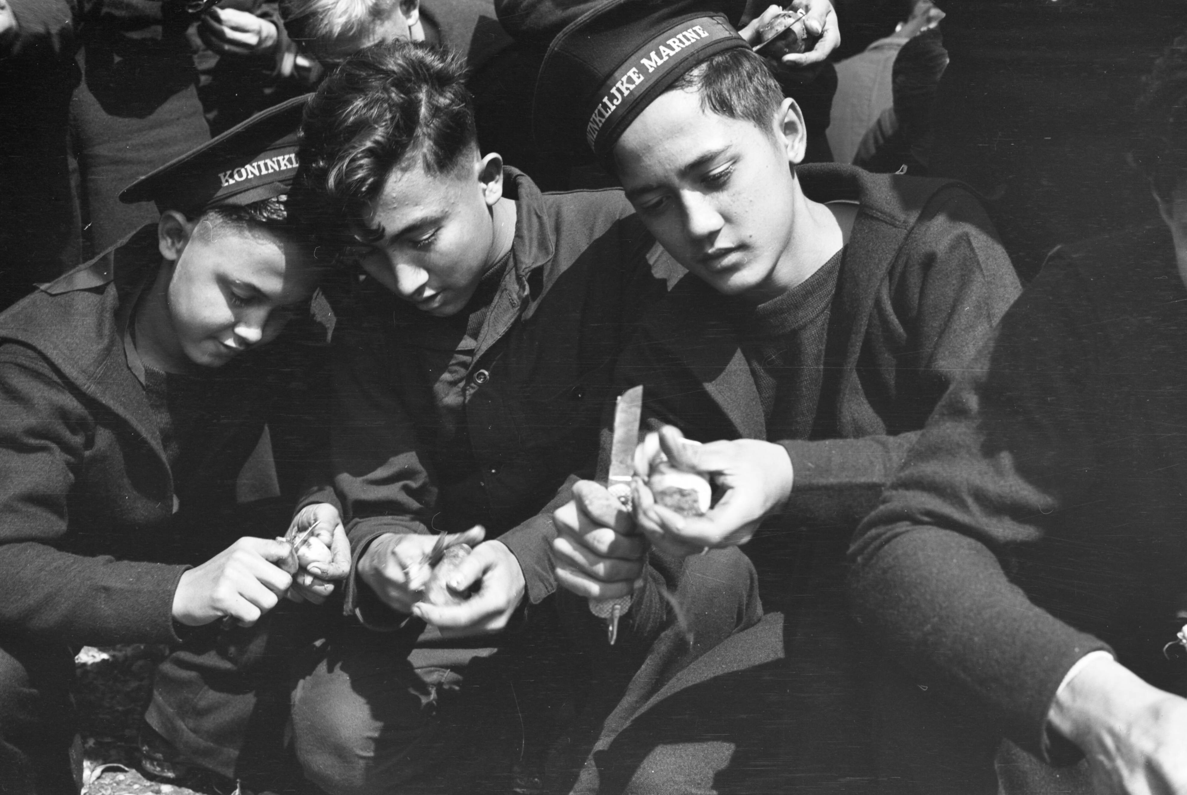 Training voor mecaniciens en telegrafisten (marconisten) in Engeland, schillen van aardappelen