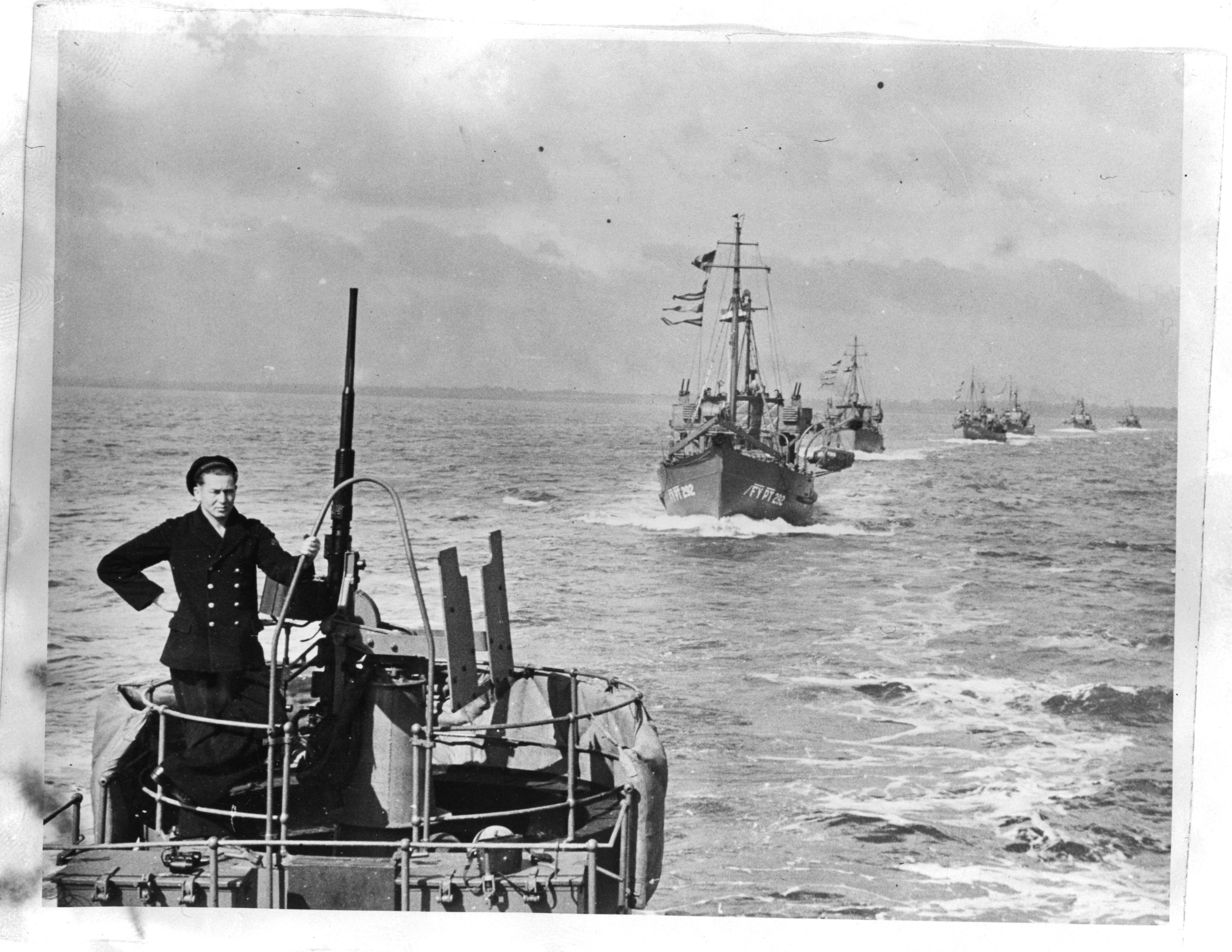 Inspectie van de Mijnveegdienst door chef Marinestaf schout-bij-nacht J.W.Termijtele. Buitengaatse vaaroefening.